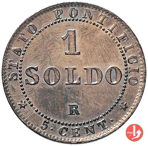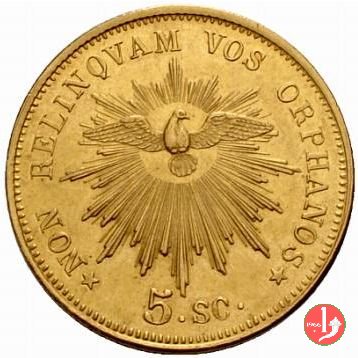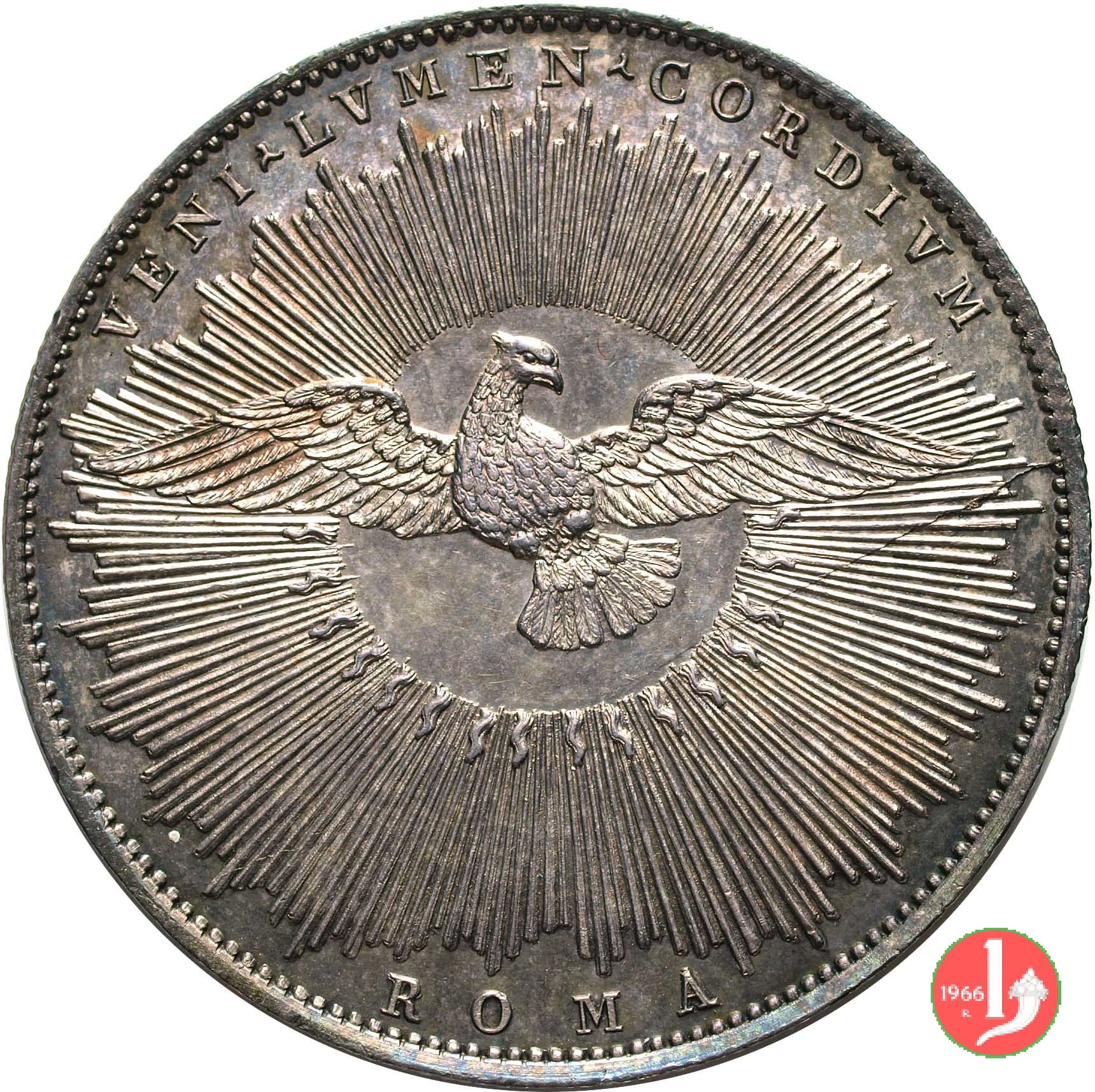 Verso: Valore (5 LIRE) e millesimo su tre righe tra due rami di lauro e quercia incrociati in basso. Intorno STATO PONTIFICIO tra 3 stellette a 5 punte. In basso segno di zecca (R).