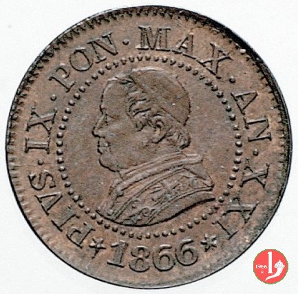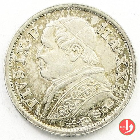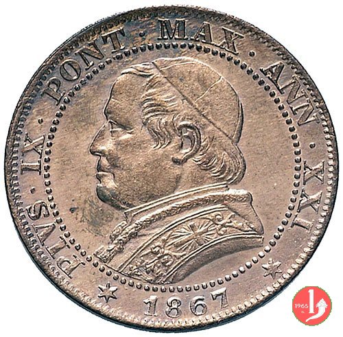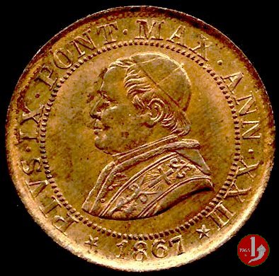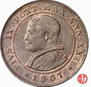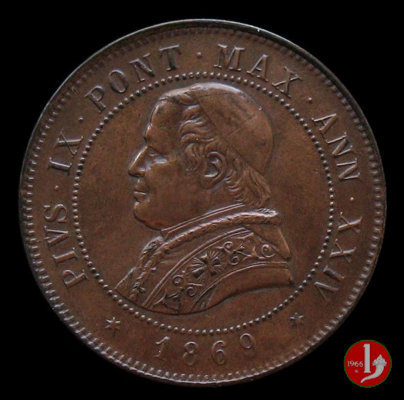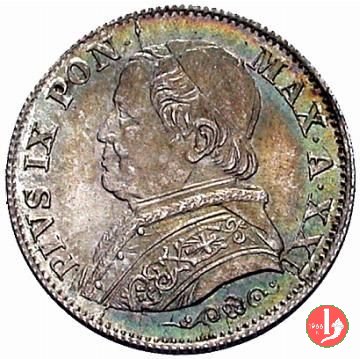 Dritto: Nel campo, busto a sinistra con zucchetta di Pio IX con sotto un fregio con una rosetta. Intorno PIVS IX PON • MAX • AN • e anno di pontificato.