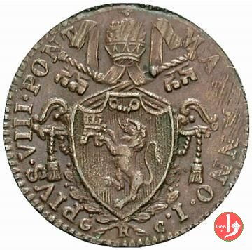 Dritto: Stemma a targa semiovale, su rami d'alloro, sormontato dalle chiavi e tiara; attorno, PIVS • VIII • PONT • - MAX • ANNO • I •; sotto, il segno di zecca tra G. C.