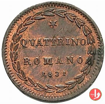 Verso: Entro ghirlanda destrorsa d'ulivo, in quattro righe: stelletta // QVATTRINO // ROMANO // 1831 (cifre 1 nella data invertite).