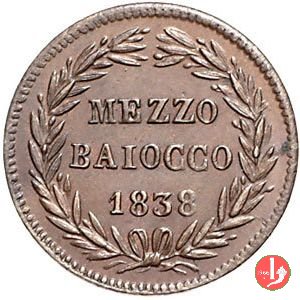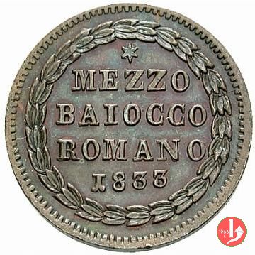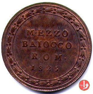 Verso: Entro corona d'alloro destrorsa, in quattro righe: MEZZO BAIOCCO ROMANO 1829, sormontato da stella.