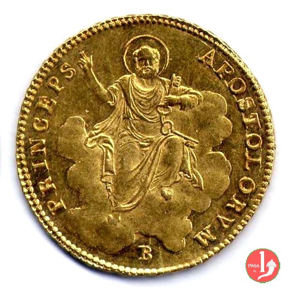Verso: San Pietro assiso su nembi di fronte e benedicente con la mano destra mentre regge le chiavi; attorno, da sinistra in b. PRINCEPS - APOSTOLORVM; in basso, indicazione dell'autore (per l'anno I) e segno di zecca.