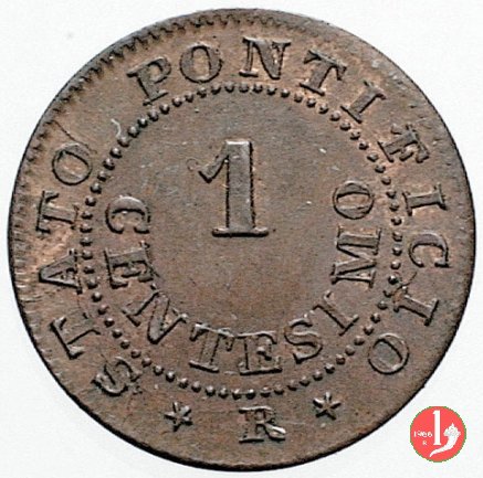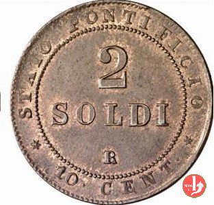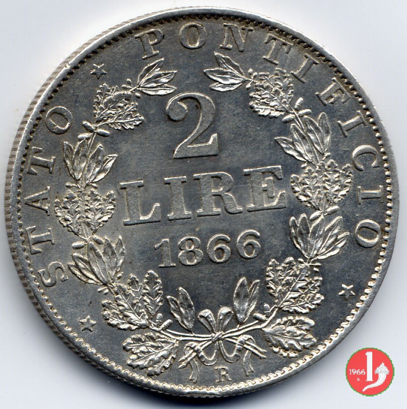 Verso: Valore (2 LIRE) e millesimo su tre righe tra due rami di lauro e quercia incrociati in basso. Intorno STATO PONTIFICIO tra 3 stellette a 5 punte. In basso segno di zecca (R).
