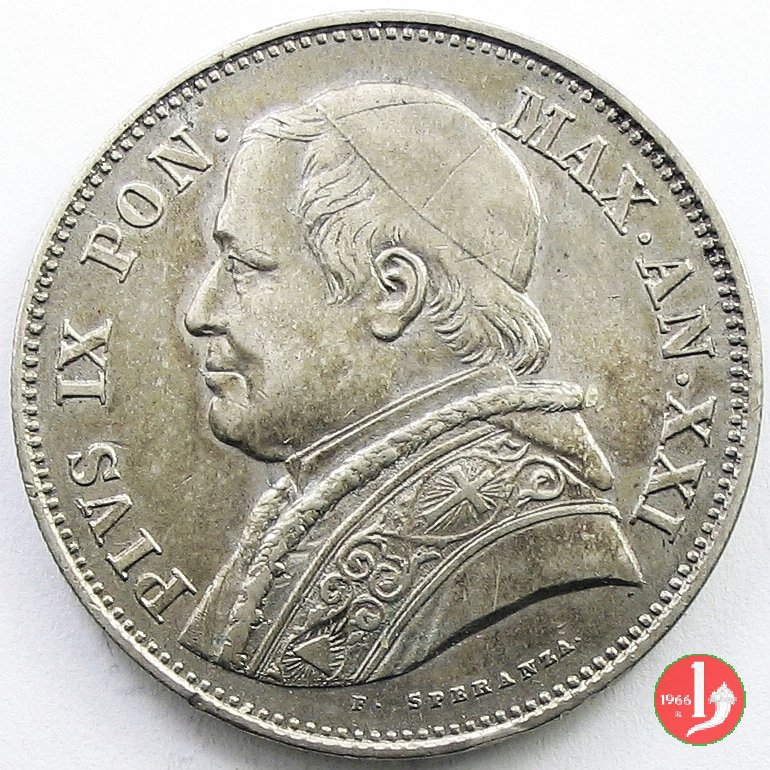 Dritto: Nel campo, busto a sinistra con zucchetta di Pio IX con sotto l'indicazione dell'incisore (F •SPERANZA •). Intorno PIVS • IX PON • MAX • AN • XXI.
