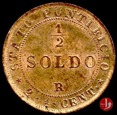 Verso: Indicazione del valore (MEZZO BAIOCCO ROM •) e millesimo su quattro righe in ghirlanda destrorsa d'alloro.
