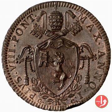 Dritto: Stemma a targa semiovale, su rami d'alloro, sormontato dalle chiavi e tiara; attorno, PIVS VIII PONT - MAX • ANNO I •; sotto, il segno di zecca tra G. C.
