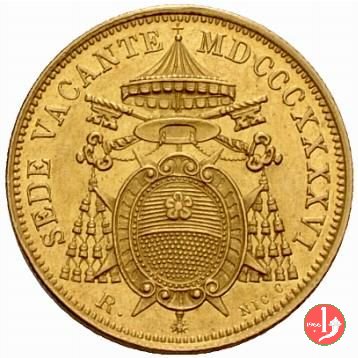 Dritto: Stemma a targa ornato e sormontato da tiara e chiavi con impugnatura poligonale, cordoni e fiocchi; attorno: GREGORIVS • XVI - PONT • MAX • AN • e l'anno di pontificato; sotto, il segno di zecca, tra le abbreviazioni N. C.