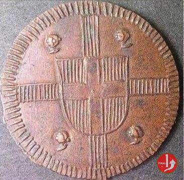 Verso: Scudo sardo rotondo, con aquila sabauda in cuore, coronato, intorno DVX • SAB • ET • MONTISFER • PRINC • PED • & •