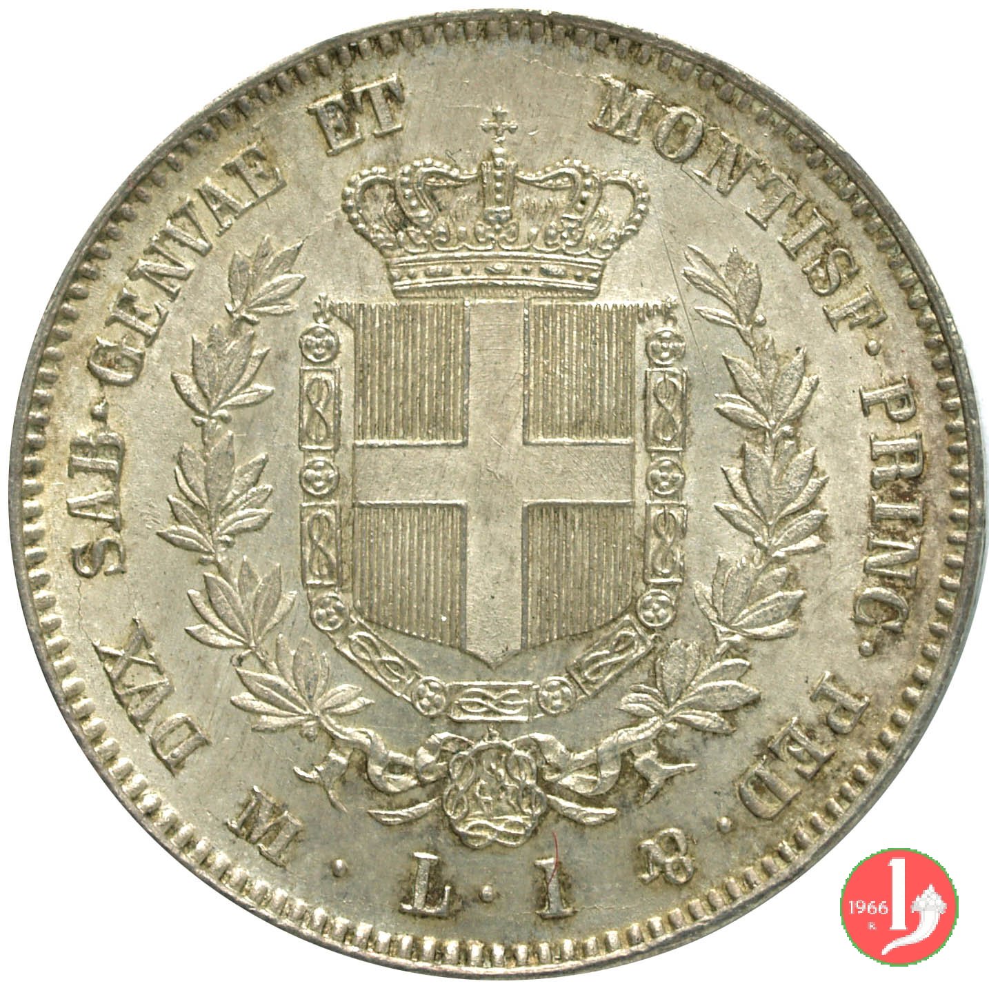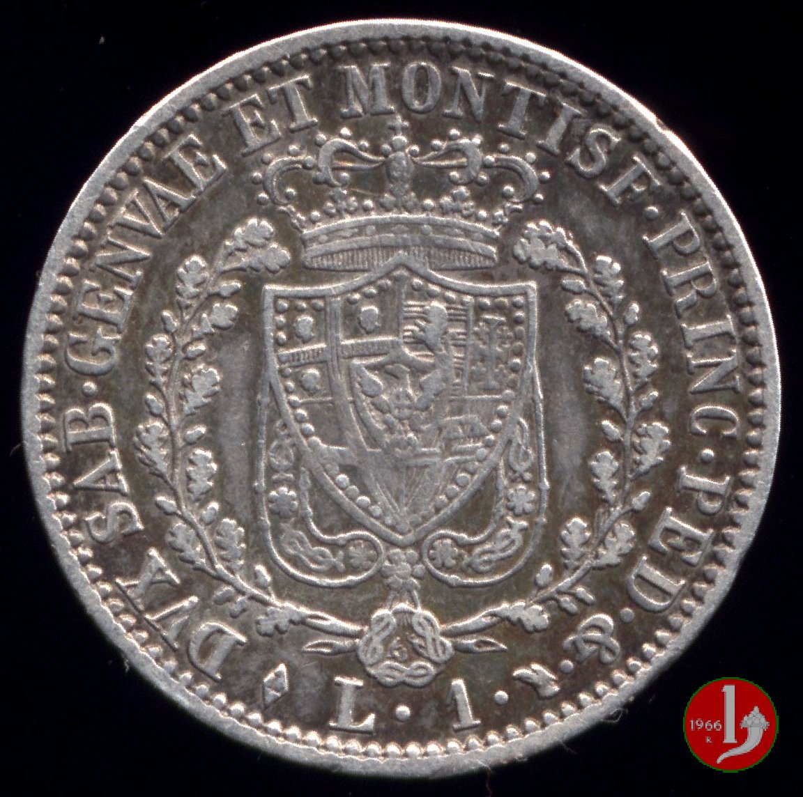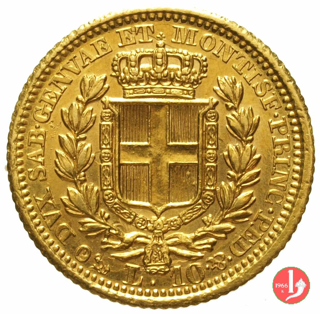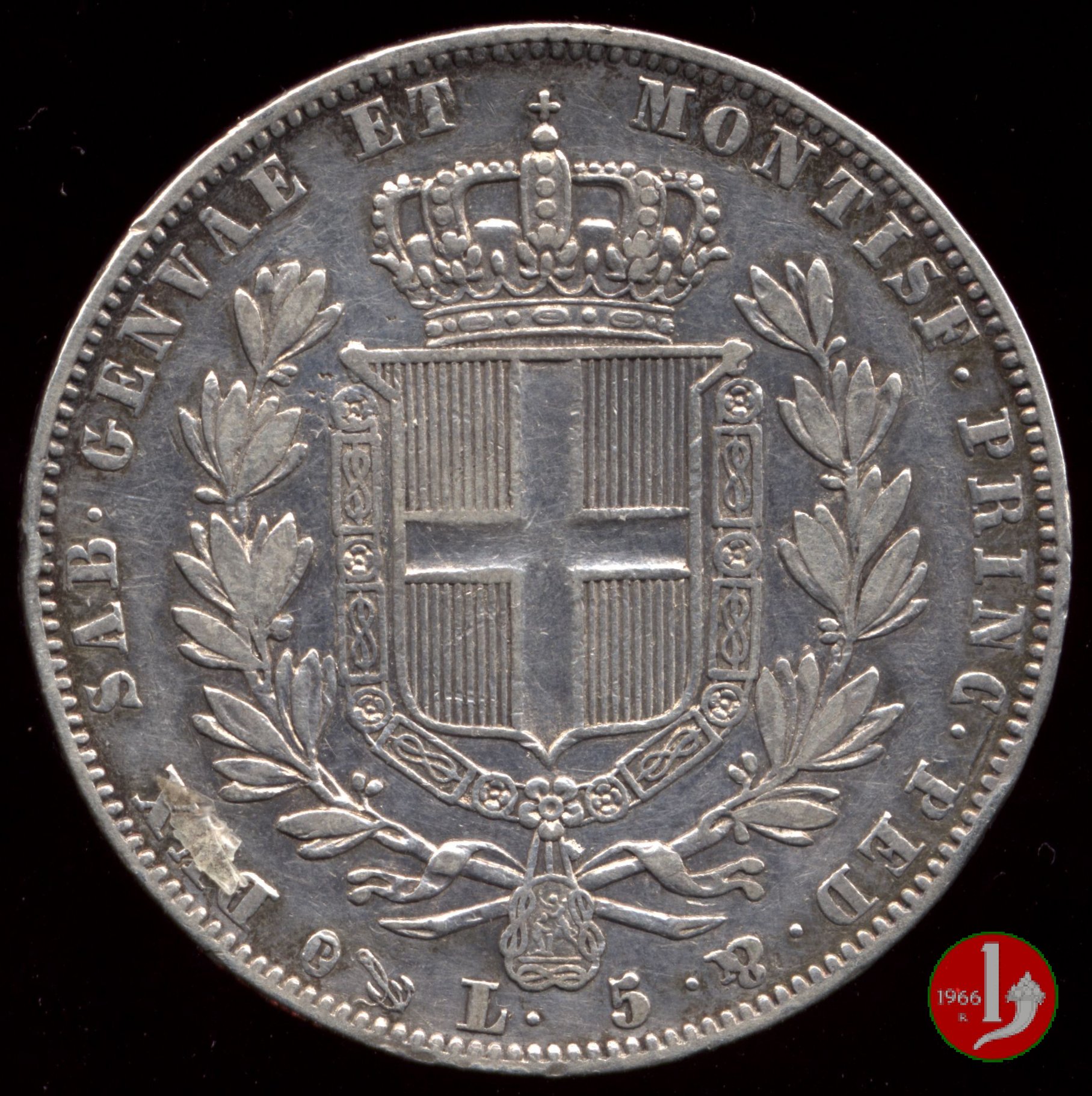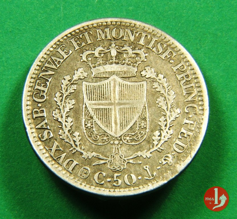 Verso: Scudo sardo con collare dell' annunziata intorno e aquila sabauda in cuore, coronato con intorno DUX • SAB • ET • MONTISFER • PRINC • PED • & •