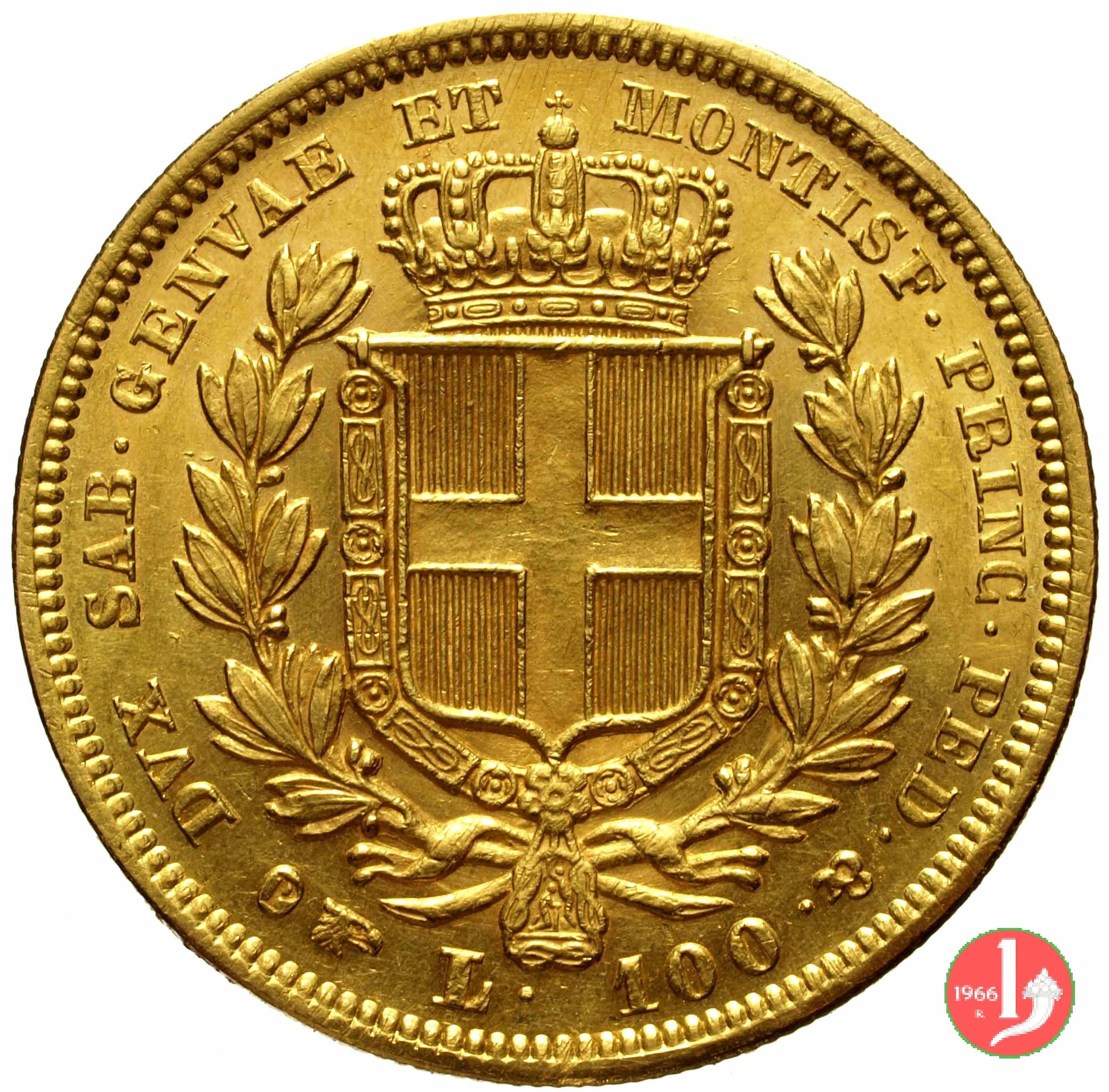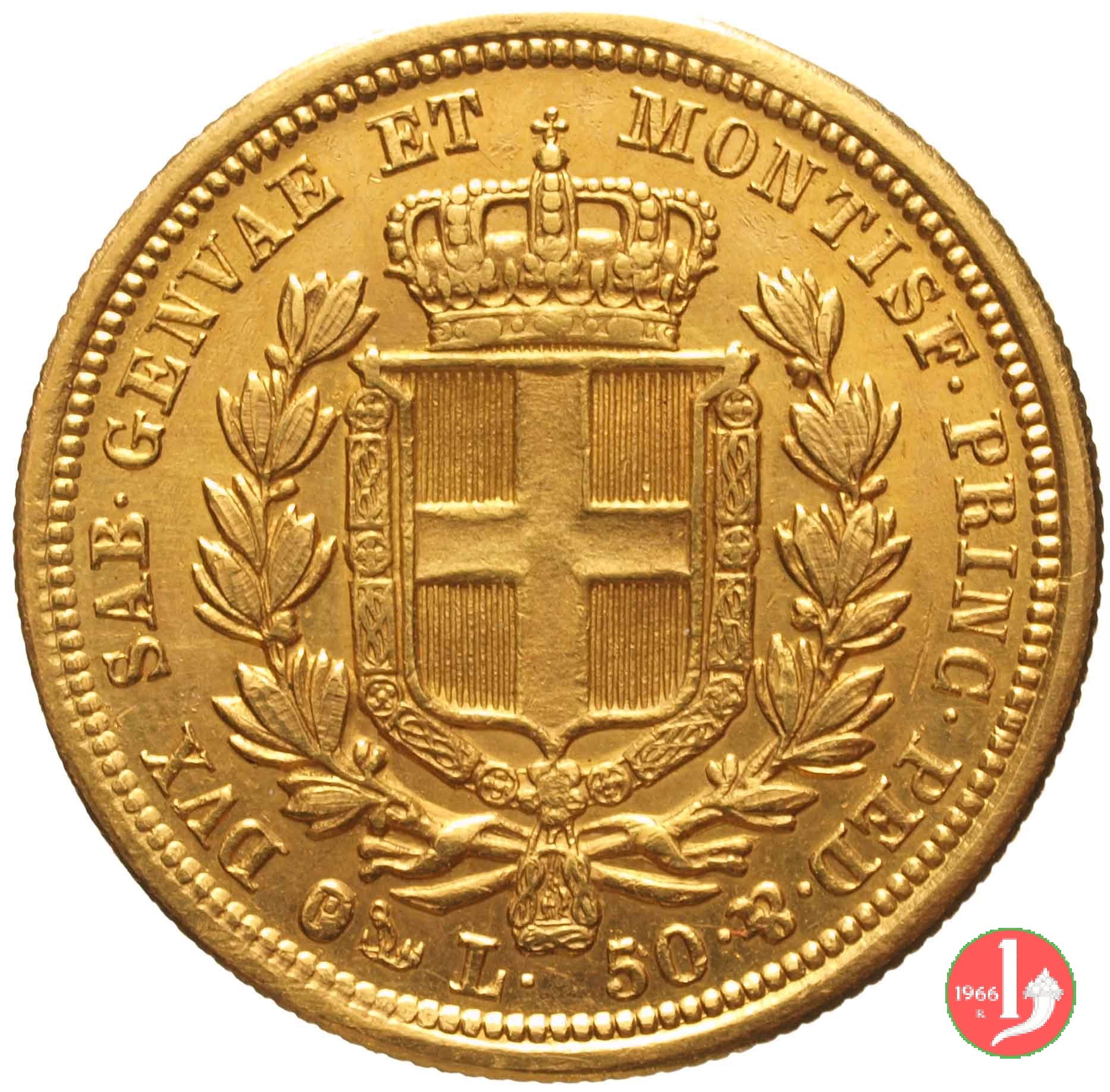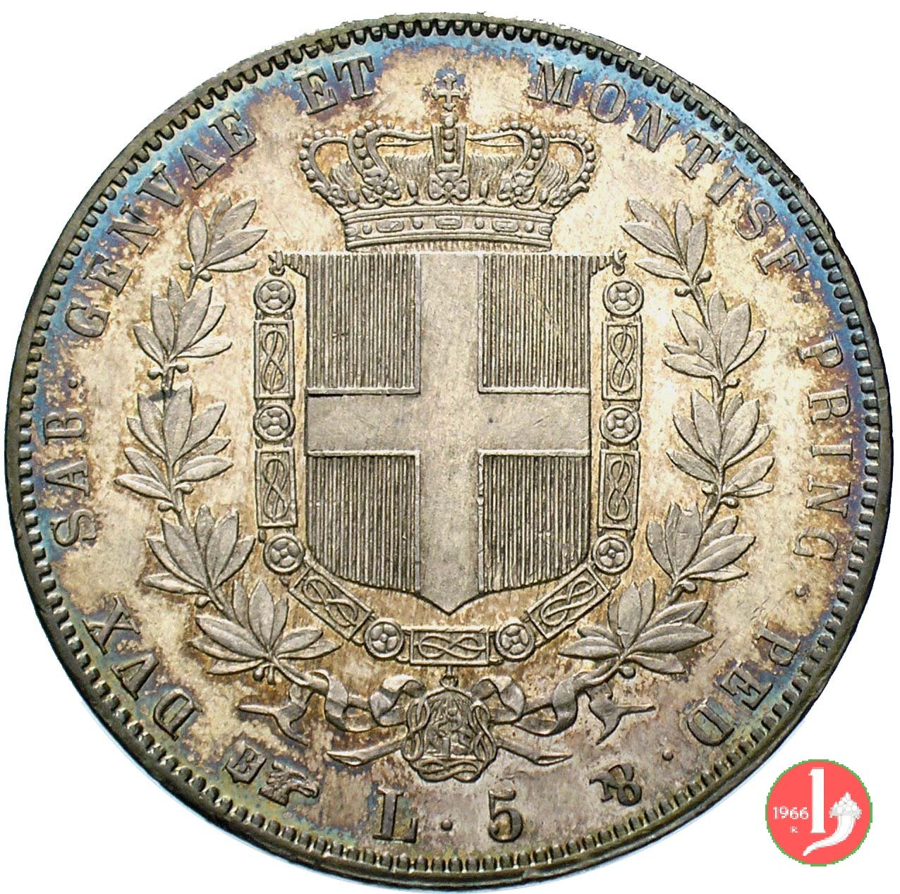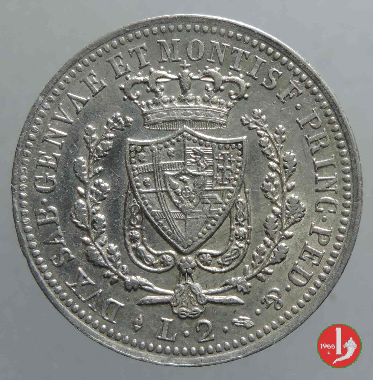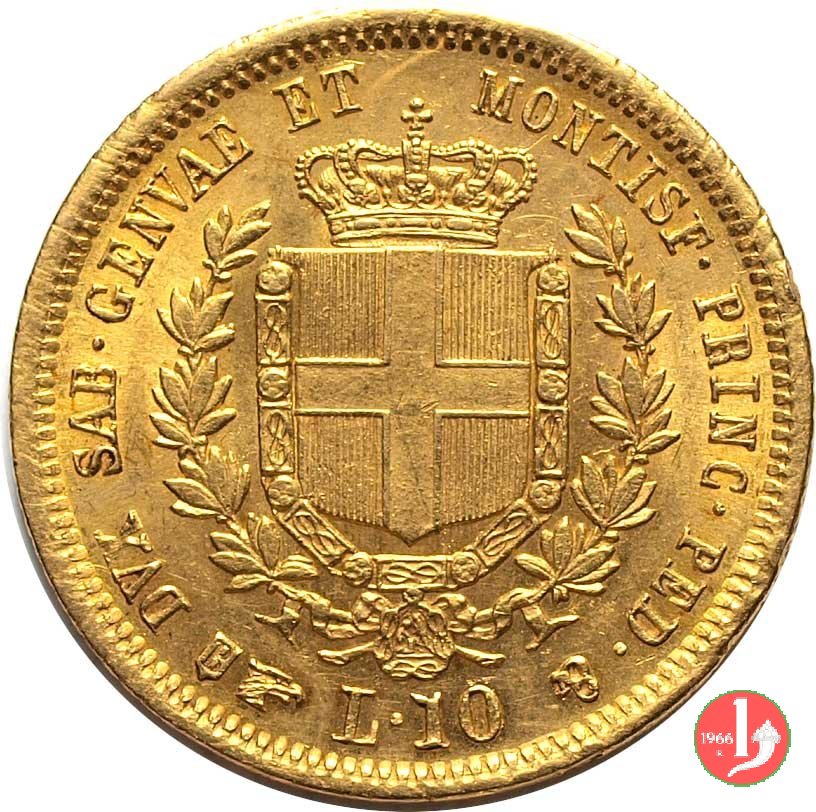 Verso: Scudo sardo con collare dell' annunziata intorno e aquila sabauda in cuore, coronato con intorno DUX • SAB • ET • MONTISFER • PRINC • PED • & •