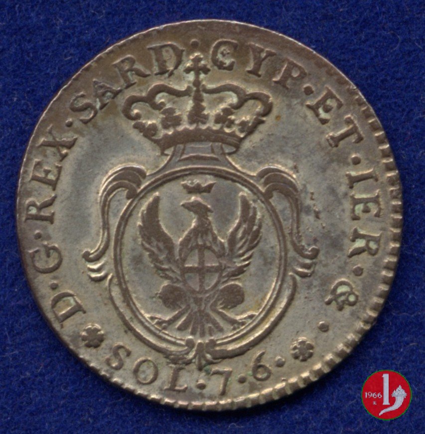 Verso: Nel campo, aquila sabauda ad ali spiegate all'interno di uno scudo ovale con corona Reale. Intorno: rosetta, D • G • REX • SARD • CYP • ET • IER • & •, rosetta e indicazione del valore (SOL • 7 • 6 •).