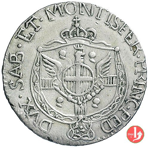 Verso: Scudo inquartato rotondo con aquila sabauda in cuore, coronato e con intorno il collare dell' annunziata, intorno DUX • SAB • ET • MONTISFER • PRINC • PED • & •.