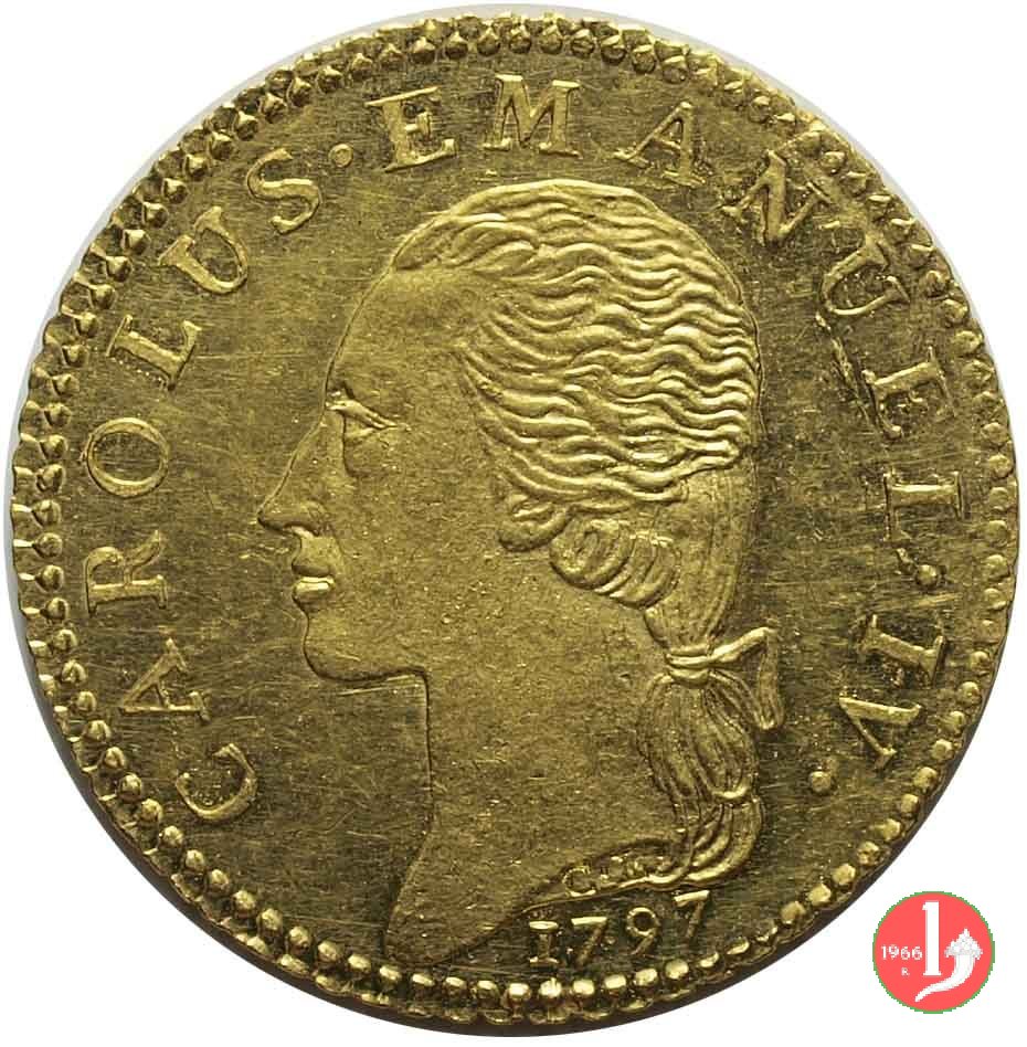Dritto: Semibusto del Re volto a destra. Intorno CAROLUS • EMANUEL • IV •. Sotto il collo del Re il millesimo.