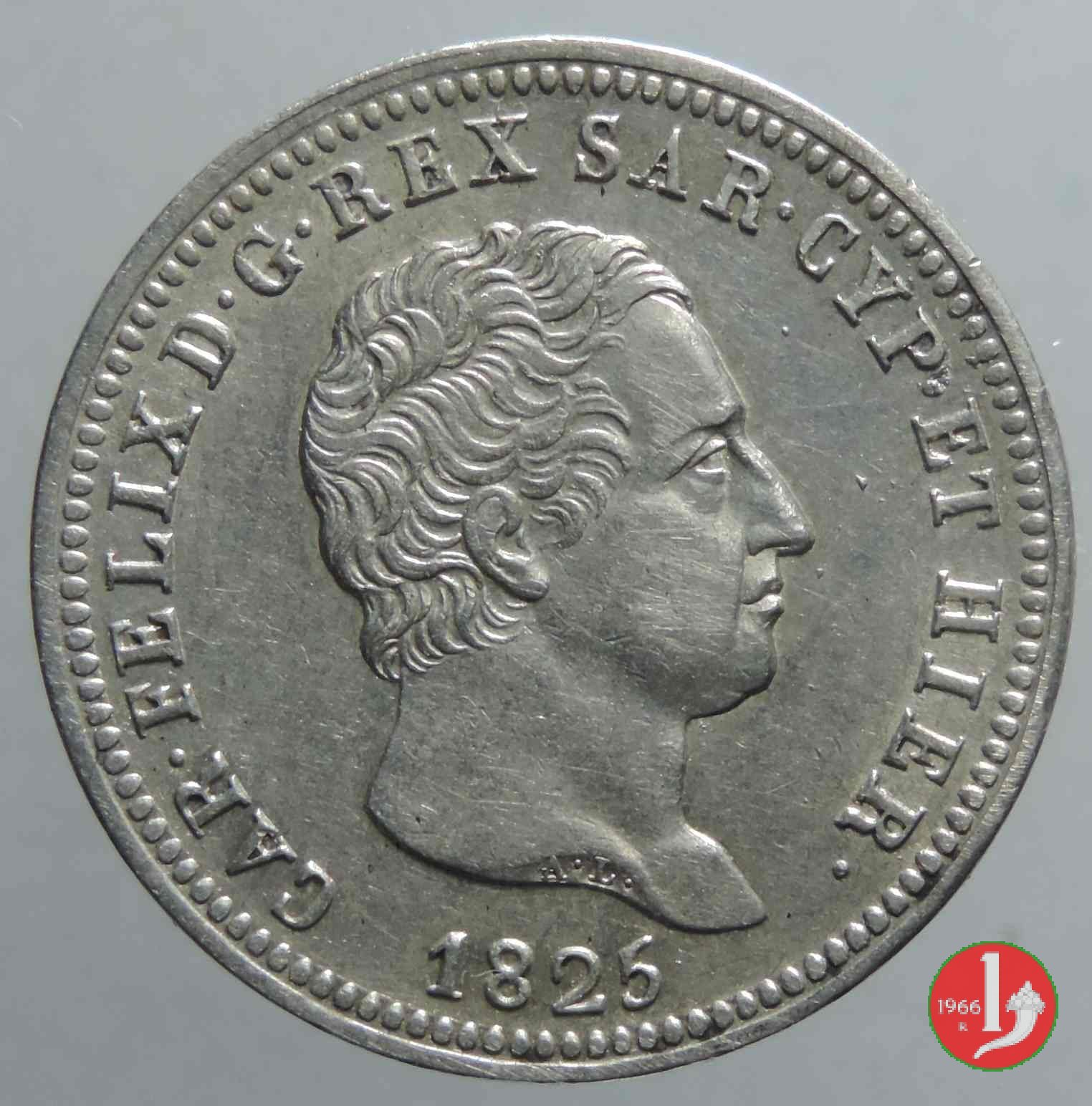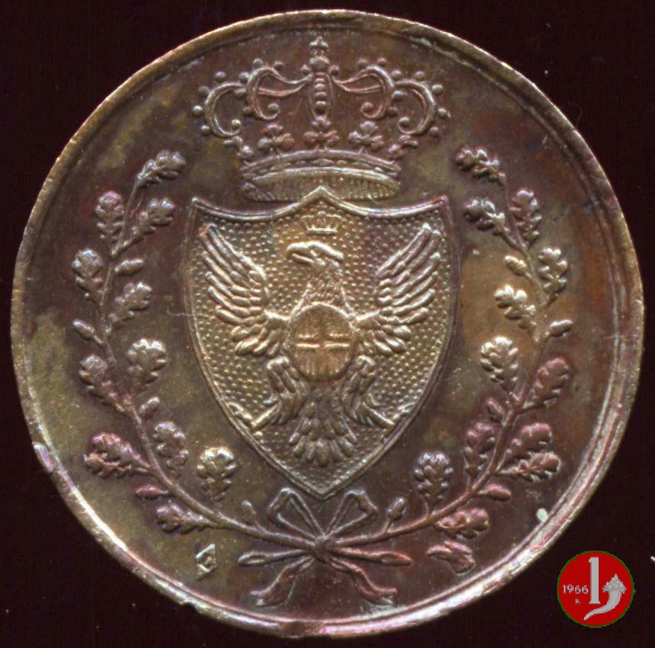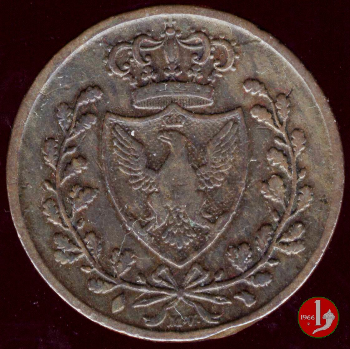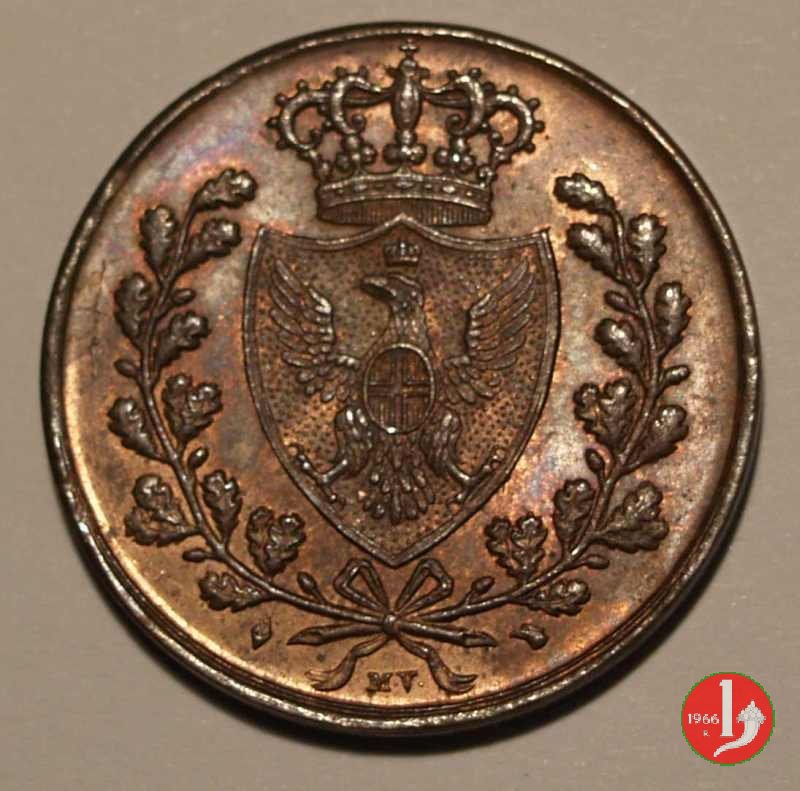 Verso: Stemma sabaudo ovale ornato dal collare dell'Annunziata. Intorno DVX • SABVD • ET • MONTISFER • PRINC • PEDEM • & • nelle monete del 1814 e DVX • SAB • IAVNAE • ET • MONTISF • PRINC • PED • & • in quelle del 1815.