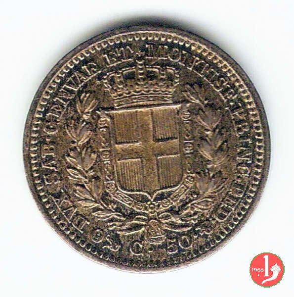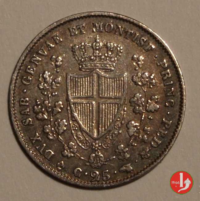 Verso: Scudo sardo sagomato con aquila sabauda in cuore,coronato, con sotto il collare dell' annunziata, intorno DVX • SAB • ET • MONTISFER • PRINC • PED • & •.
