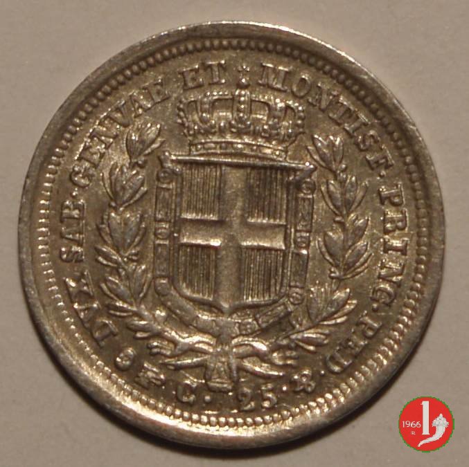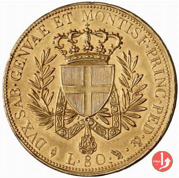 Verso: Scudo sardo sagomato con aquila sabauda in cuore,coronato, con sotto il collare dell' annunziata, intorno DVX • SAB • ET • MONTISFER • PRINC • PED • & •