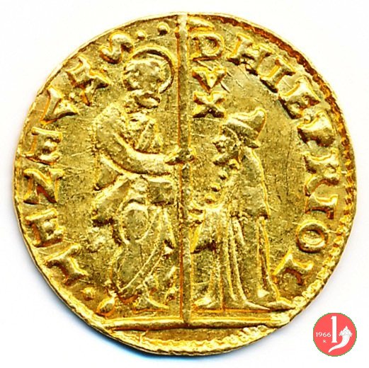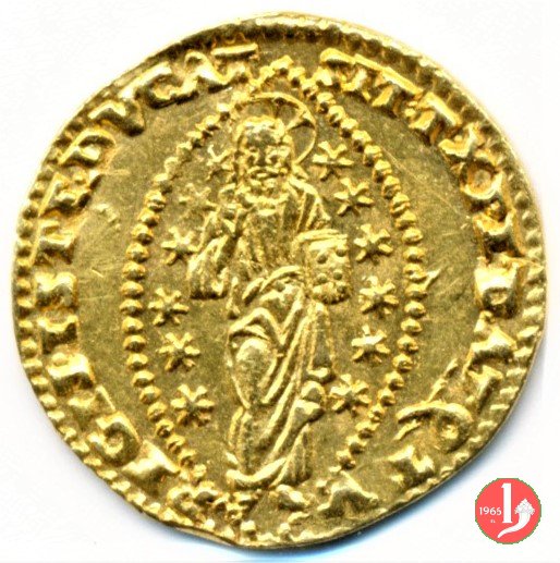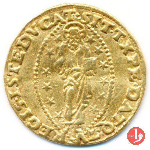 Zecchino Dritto: (globetto) LAV (globetto) PRIOL (globetto) S (globetto) M (globetto) VENET, San Marco stante a destra e il doge inginocchiato a sinistra reggono il vessillo, lungo l'asta DVX Verso: SIT (globetto) T (globetto) XPE (globetto) DAT Q TV REGIS (globetto) ISTE (globetto) DVCAT, il Redentore stante in mandorla di perline con 12 stelle | |