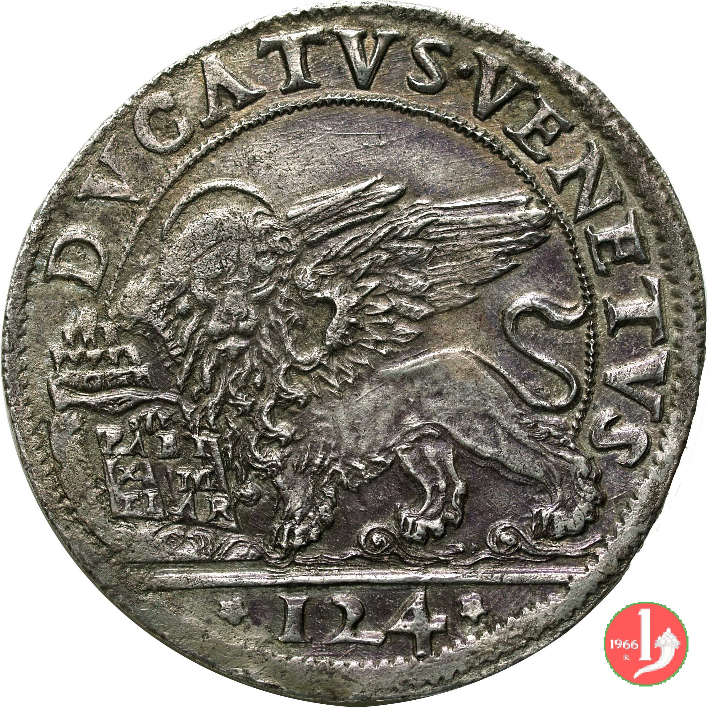 Ducato in argento da 124 soldi Dritto: HIER PRIOLO.DVX.S.M.VENETVS San Marco in trono, a destra, porge con la mano sinistra il vessillo sormontato da croce al Doge, che genuflesso innanzi a lui riceve con la mano sinistra, mentre si porta la destra al petto. Verso: DVCATVS VENETVS il leone di San Marco, nimbato ed alato, stante verso sinistra; le zampe posteriori in acque agitate del mare, mentre le anteriori, in terraferma sostengono il libro aperto. Dietro, a sinistra, la rocca. All'esergo *124* | |
