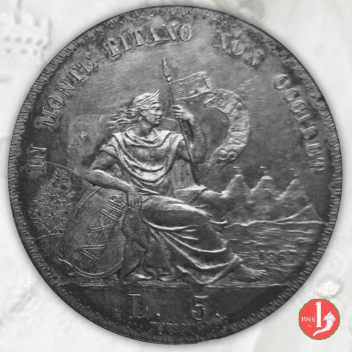 Verso: Figura femminile seduta rivolta a destra, con capelli svolazzanti e manto a larghi panneggiamenti appogiata a scudo ovale che reca nel campo un fascio consolare. La figura tiene con la mano sinistra una banderuola ondeggiante su cui è riportata la scritta in incusso LIBERTAS. A sinistra dietro lo scudo un ulivo. A destra sullo sfondo, il Monte titano con le tre torri sormontate da pennacchi e in basso destra vicino al piede della figura la data 1867. Nell'esergo il valore L.5. e la firma dell'incisore P. Thermignon. Attorno: IN MONTE TITANO NON OCCIDET.