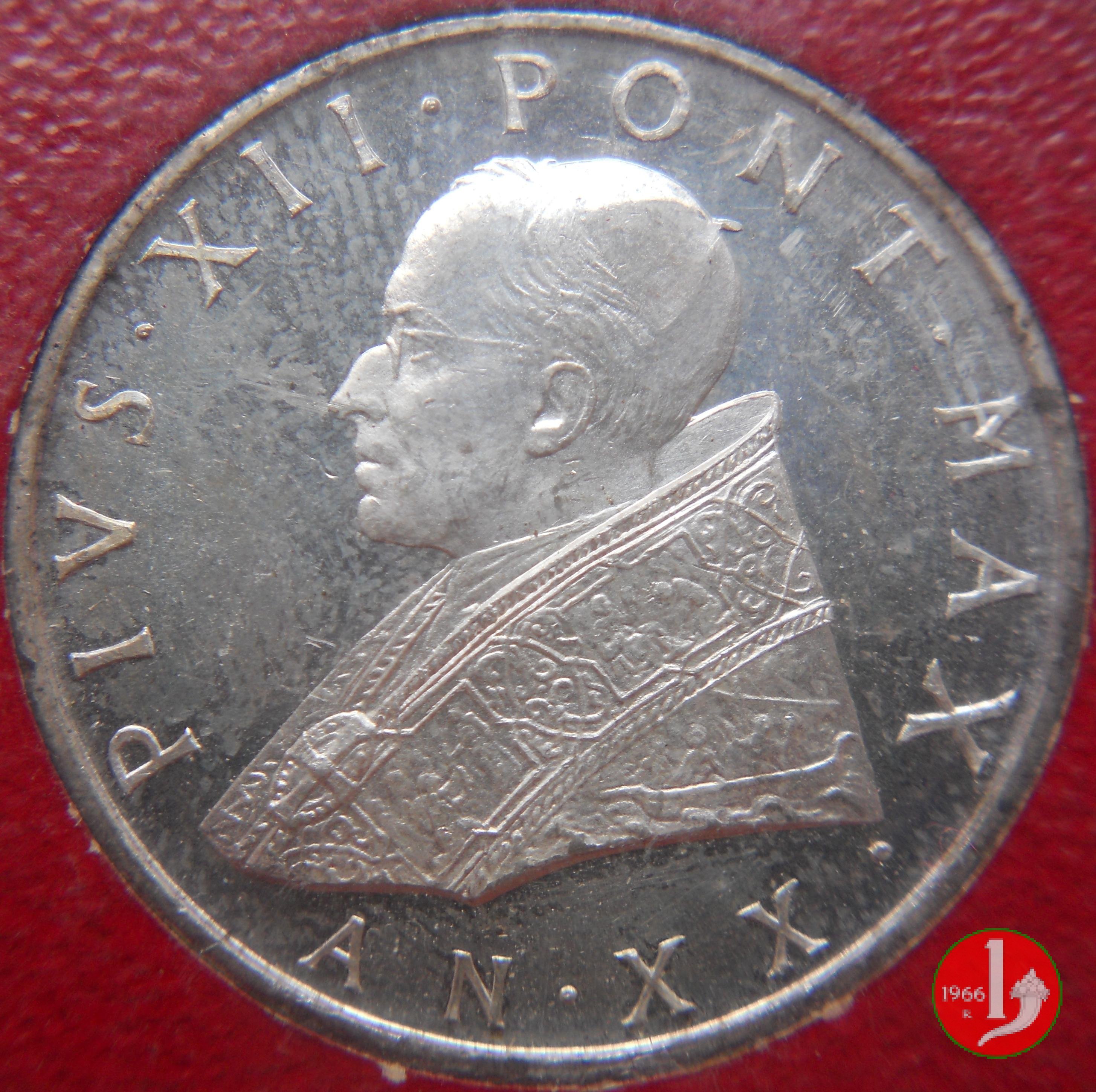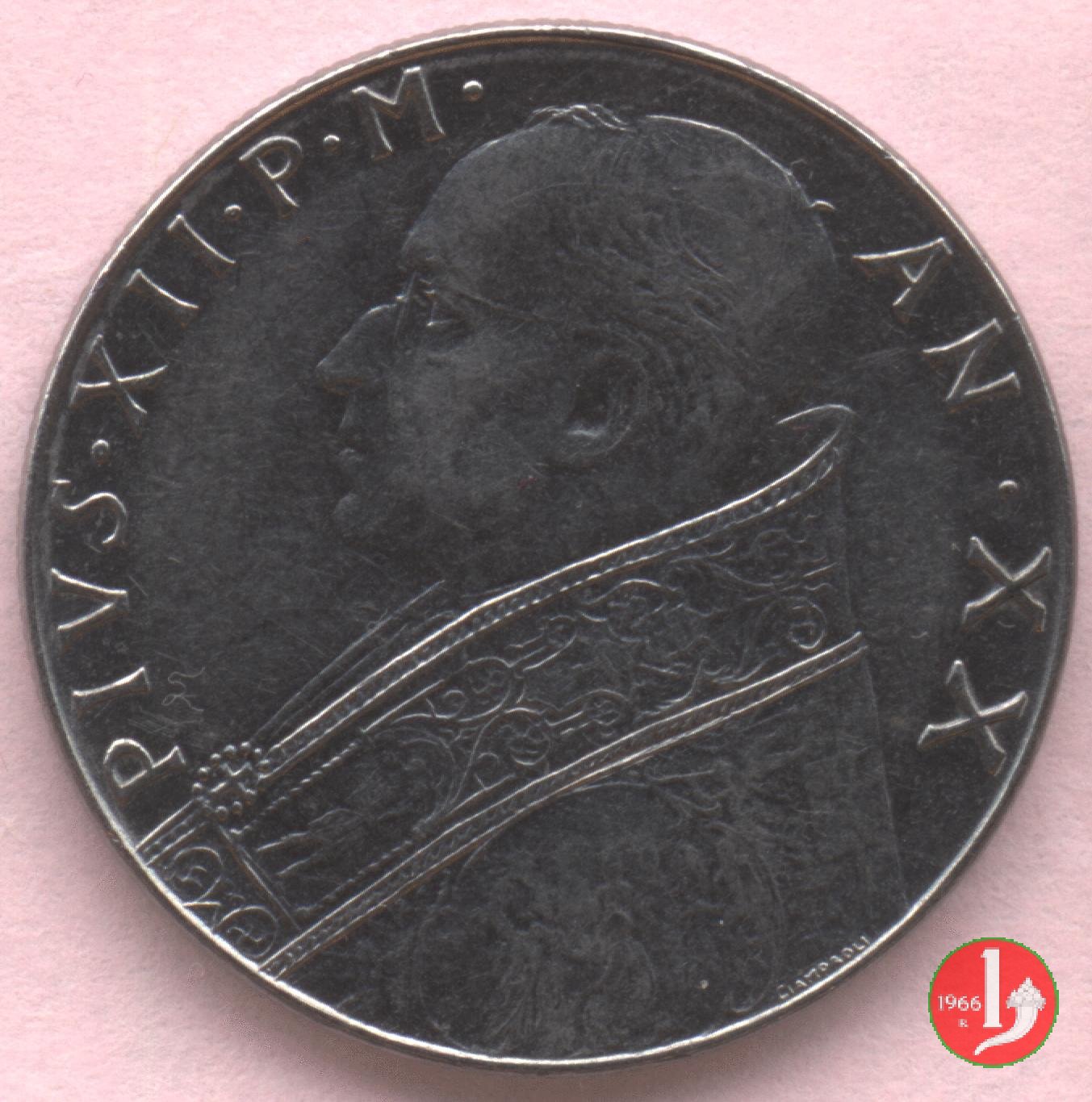 Dritto: Busto del Pontefice rivolto a sinistra con legenda: Pivs •XII •Pont •Max • In esergo : An • XX