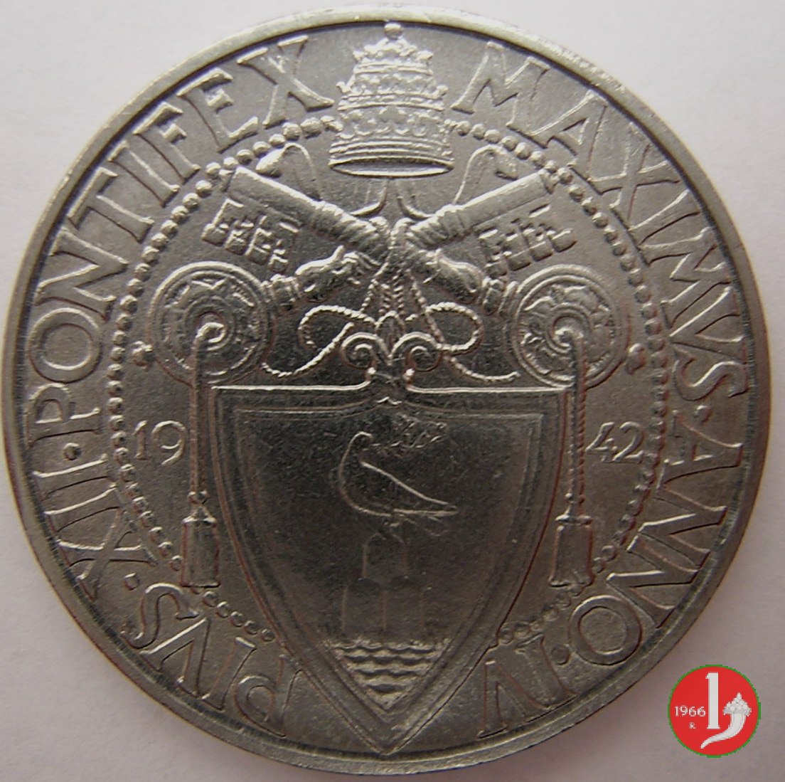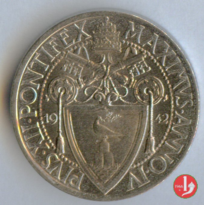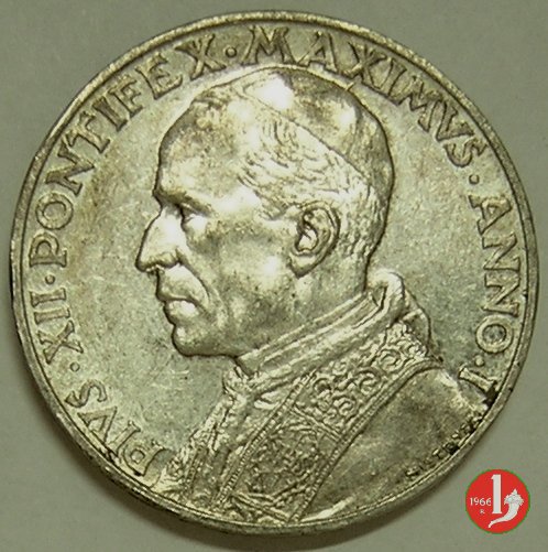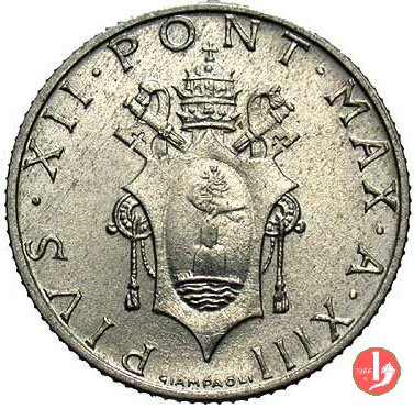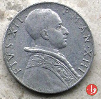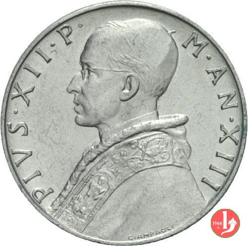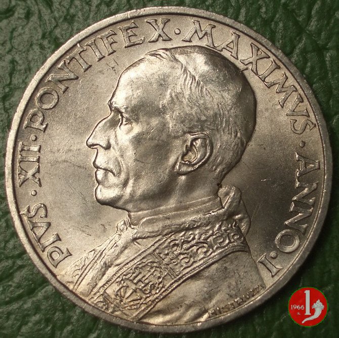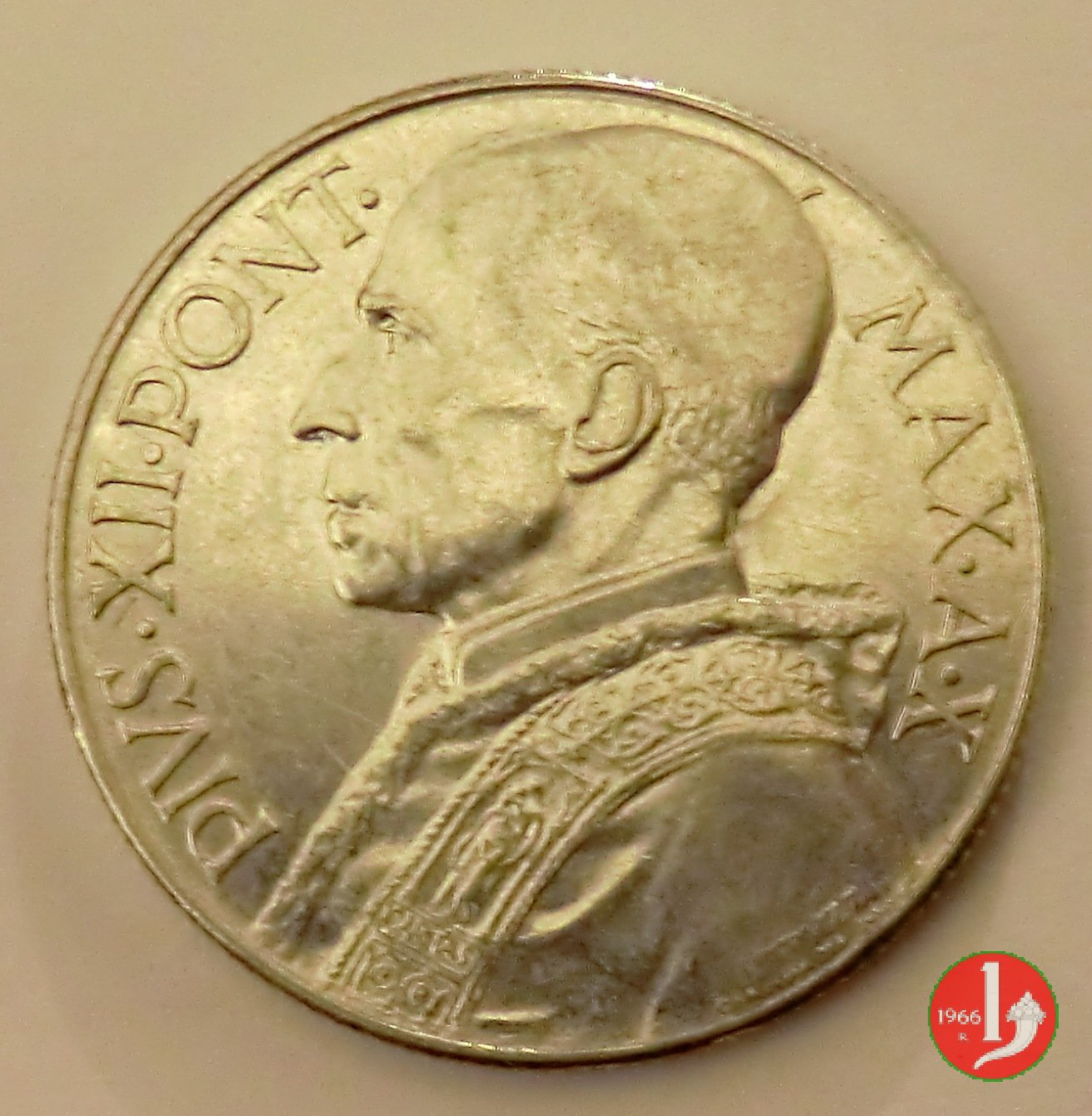 Dritto: Pivs XII P M An (anno di pontificato)in legenda con al centro busto del Pontefice rivolto a sinistra.