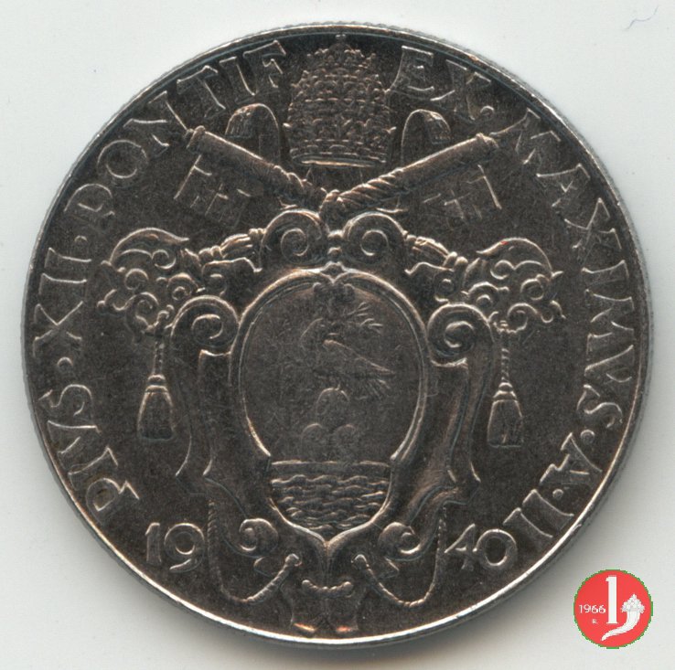 Dritto: Busto del Pontefice rivolto a sinistra con legenda:Pivs •XII •Pont •Max Sotto il busto l'anno di pontificato.