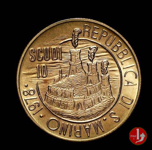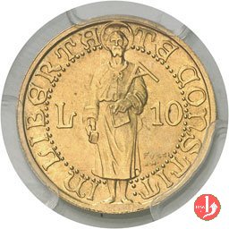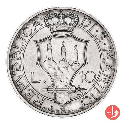 Dritto: All'interno di un cerchio, stemma araldico di San Marino con le tre torri piumate e sormontato dalla corona della sovranità. Ai suoi lati indicazione del valore (L 10) e, in basso, un fascio con scure in orizzontale. Intorno, REPVBBLICA DI S MARINO, in basso indicazione degli autori (E SAROLDI A M INC.) e il segno di zecca (R).