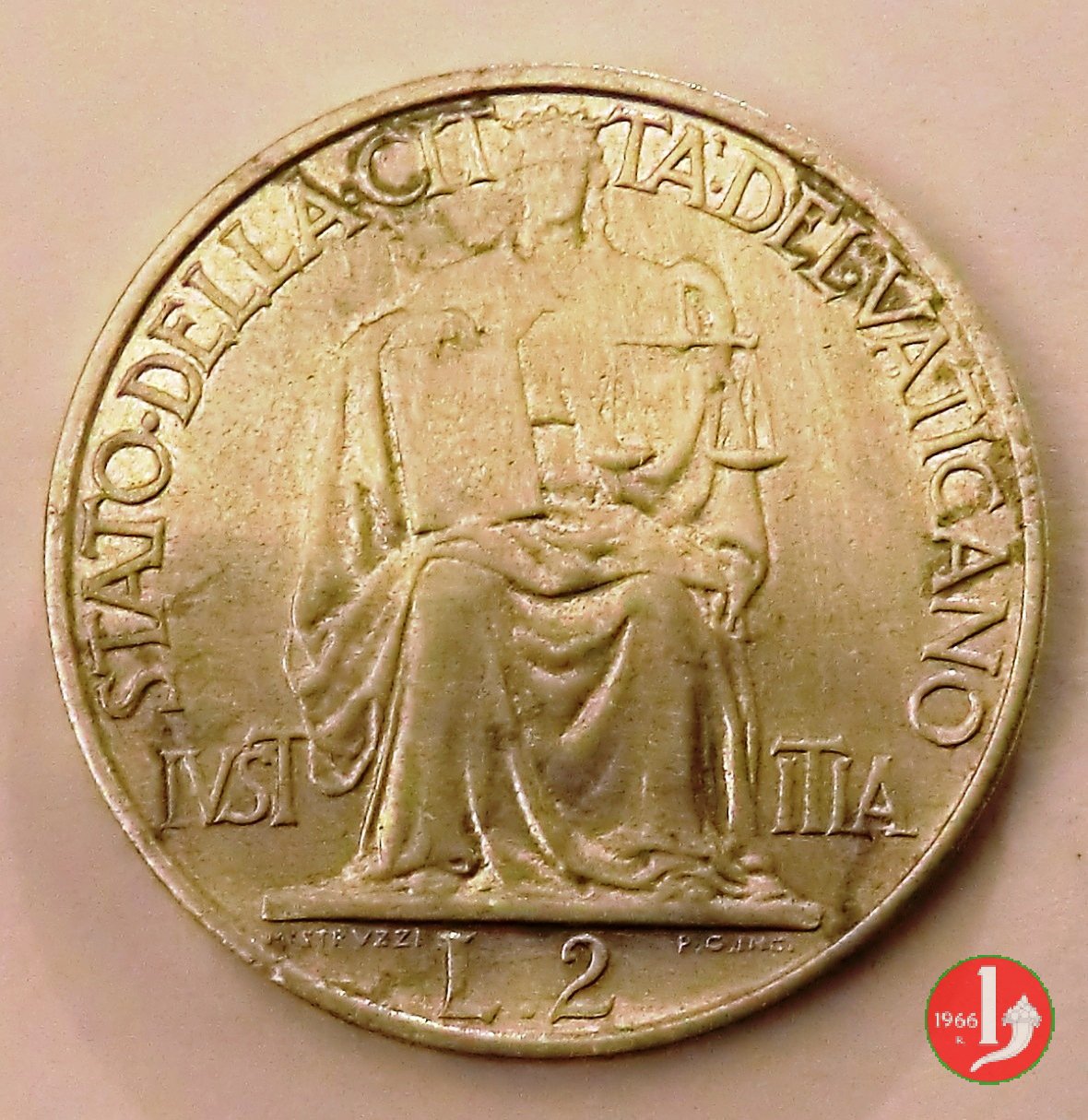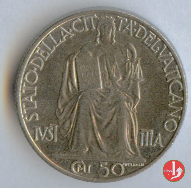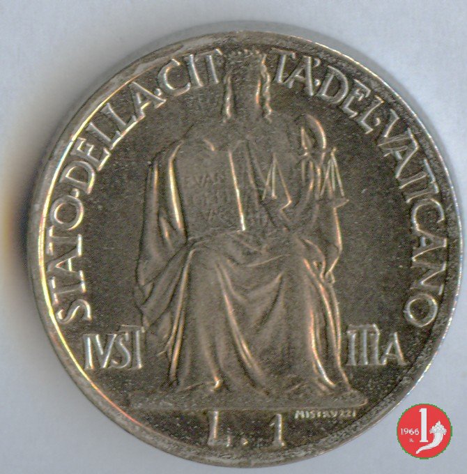 Verso: La Giustizia seduta con il vangelo nella destra e bilancia nella sinistra; ai lati IVST ITIA; attorno: STATO •DELLA •CITTA' •DEL •VATICANO e nell'esergo il valore con alla destra MISTRUZZI e P. G. INC.