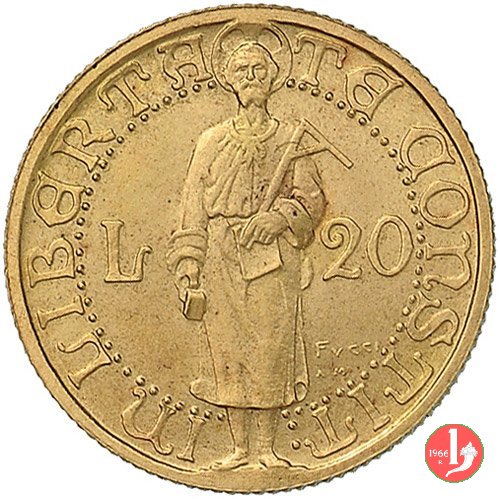 Verso: San Marino in piedi all'interno di un cerchio di perline con ai lati indicazione del valore (L 20). Intorno IN LIBERTÀ TE CONSTIT :.