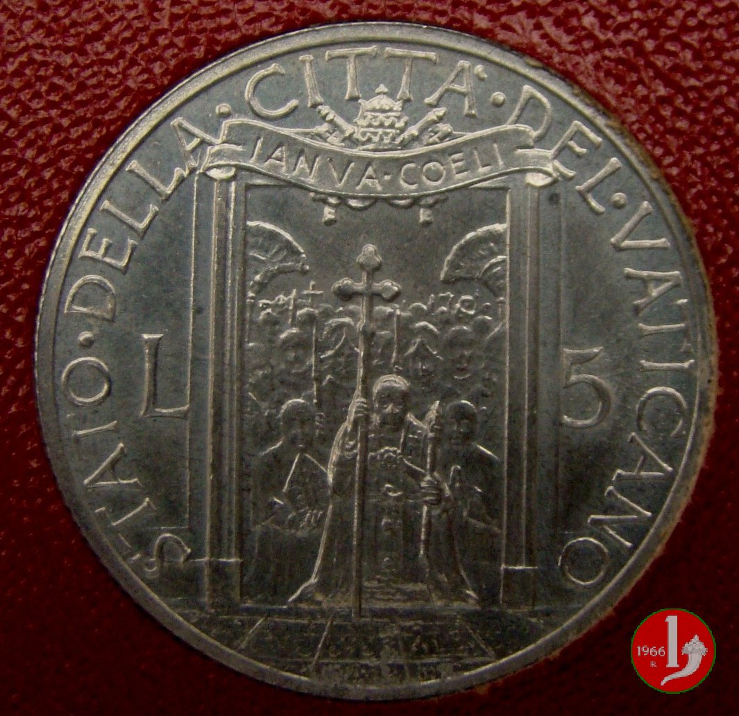 Verso: STATO •DELLA •CITTA •DEL •VATICANO. Il Pontefice genuflesso davanti alla porta Santa aperta;in alto un nastro con la scritta IANVA •COELI in incuso.Ai lati il nominale.