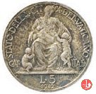 Verso: All'interno di un cerchio di perline, aratro sormontato da un ramo d'ulivo e indicazione del valore (L 5). Intorno, FORTIS IN TEMPERANTIA. In esergo, fascio con scure posto in orizzontale al di sotto del quale si trova l'indicazione del segno di zecca (R) posto tra E SAROLDI e A M INC •