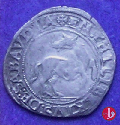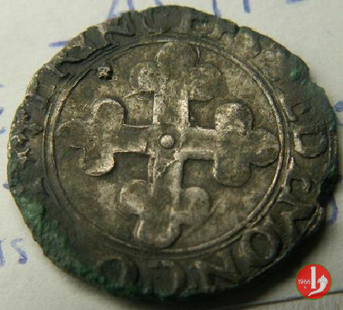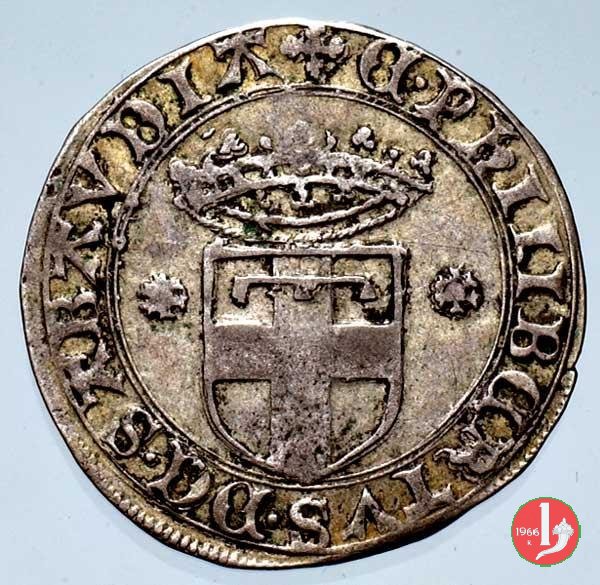 Grosso di piemonte II tipo Dritto: Un leone che sorregge uno scudo sabaudo incartocciato, in basso rette d'esergo, intorno: croce EM • PHILIBER • DUX • SABAU Verso: Croce mauriziana con intorno: croce PRINC • PEDEMO • CO • AST | |