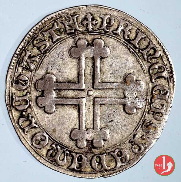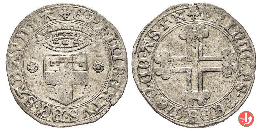 Grosso di piemonte I tipo Dritto: Un leone che sorregge uno scudo sabaudo incartocciato con il lambello, in basso rette d'esergo, intorno: croce EM • PHILIBERTUS • DE • SABAUD Verso: Croce mauriziana con intorno: croce PRINCEP • PEDEMON • CO • AST stella | |
