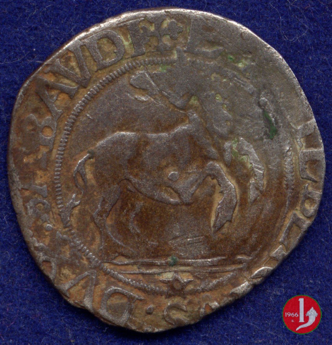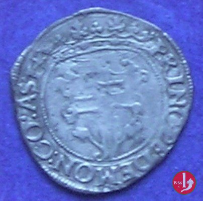 Testone I tipo Dritto: Busto giovanile del duca corazzato rivolto a sinistra, intorno: croce EM • PHILIBERT • DE • SAB • P • P • CO • AST Verso: Scudo semplice con il lambello coronato e sorretto da due leoni rampanti, in esergo tra due rosette la data | |