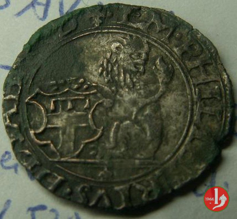 Cavallotto I tipo Dritto: Immagine di un cavallo andante a destra ma rivolto a sinistra, intorno: croce EM • PHILIBERTUS Verso: Scudo semplice con il lambello incartocciato e coronato, intorno PRINC | |