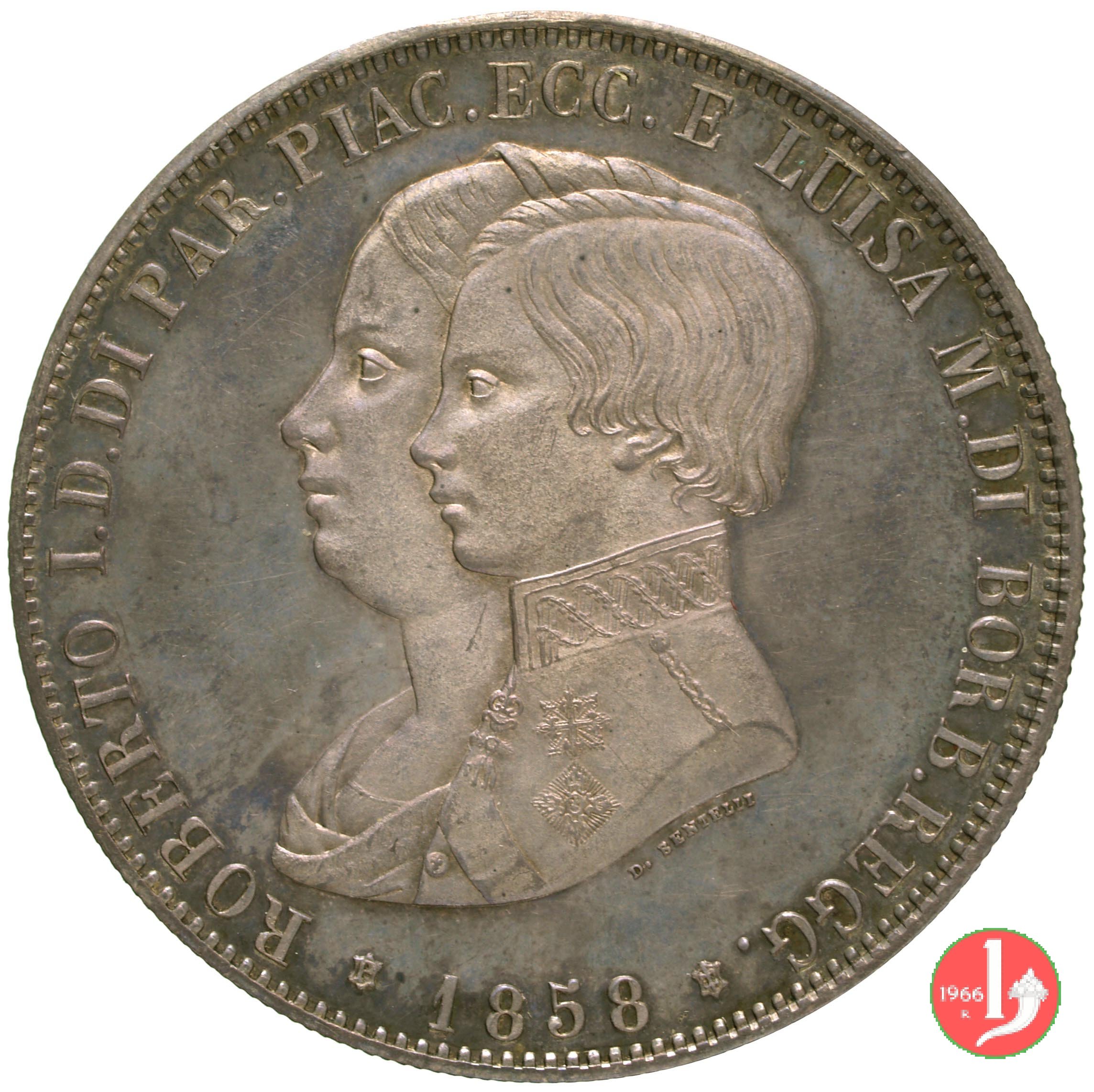 Scudo Dritto: Semibusto di Roberto I° sovrapposto a quello della madre -Maria Luisa di Berry- volti a sinistra. Intorno: ROBERTO I • D • DI PAR • PIAC • ECC • E LUISA M • DI BORBONE. In basso il millesimo (1858) tra il segno di zecca (P in scudetto) e simbolo dei Borbone (giglio in scudetto). Sotto il taglio dei busti indicazione dell'autore (D • BENTELLI). Verso: Stemma ovale dei Borbone Parma sormontato da una corona ducale. Ai suoi lati DEUS (a sinistra) ET DIES (a destra). Sotto indicazione del valore (5 LIRE). |