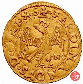 trionfo Obverse: Il Re coronato seduto in trono , di prospetto, tenendo nella destra lo scettro e nella sinistra il globo crucigero, entro circolo di perline. + FERDINANDVS • D • G • R • CASTELLE • SICILIE • ARA + FERDINANDVS | |