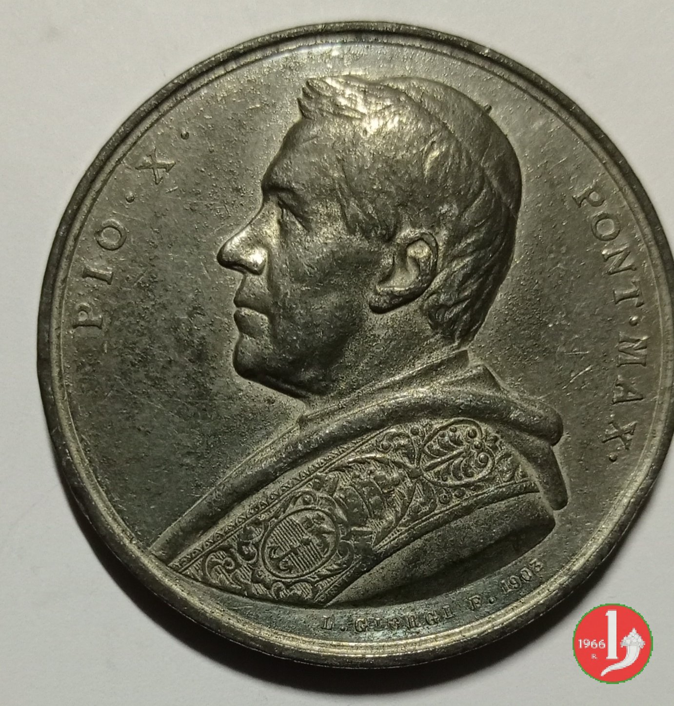 Elezione al pontificato - uniface Obverse: busto del papa di fronte attorniato dall'immagine di profilo dei Cardinali elettori nel cerchio interno: • PIVS • X • _ • PONT • MAX • | |