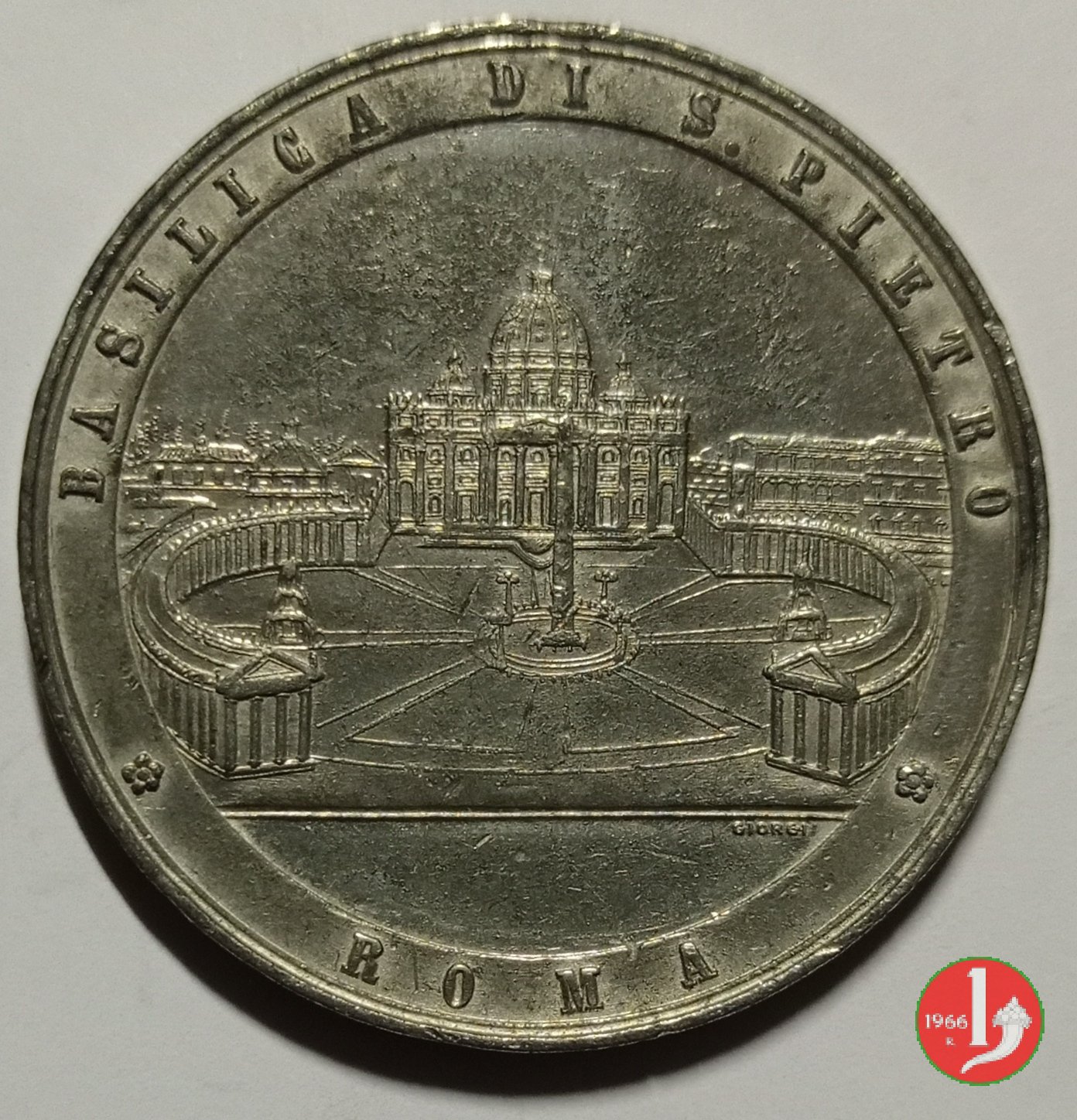 Chiostro Lateranense 34mm -Mo621 Obverse: LEONE XIII PONTEFICE MASSIMO = ✠ 1846 1878 ✠ busto a sx con berretto, mozzetta e stola in basso, a sx: GIANDOMENICO vista del Chiostro | |