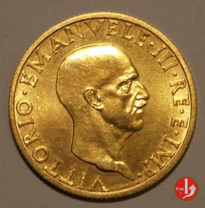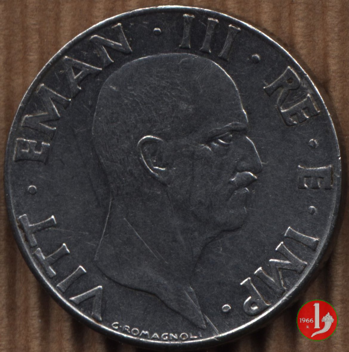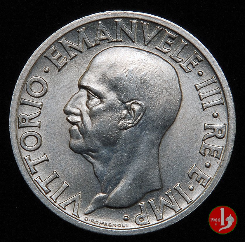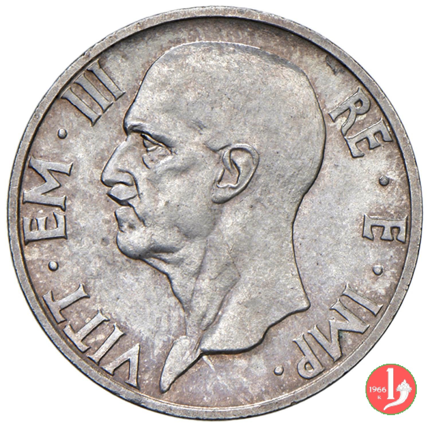 50 lire littore Obverse: Busto del Re in uniforme volto a sinistra, attorno: VITT • EM • III • RE •. Sotto il collo del Re, lungo il bordo, i nomi dell'autore (G. ROMAGNOLI) e dell'incisore (A. MOTTI INC.). Reverse: Littore con fascio littorio appoggiato sulla spalla sinistra che procede verso destra. A destra in basso indicazione del valore (L. 50) sotto al quale vi è l'indicazione del millesimo e dell'anno dell'Era Fascista, in corrispondenza a sinistra segno di zecca (R). | |