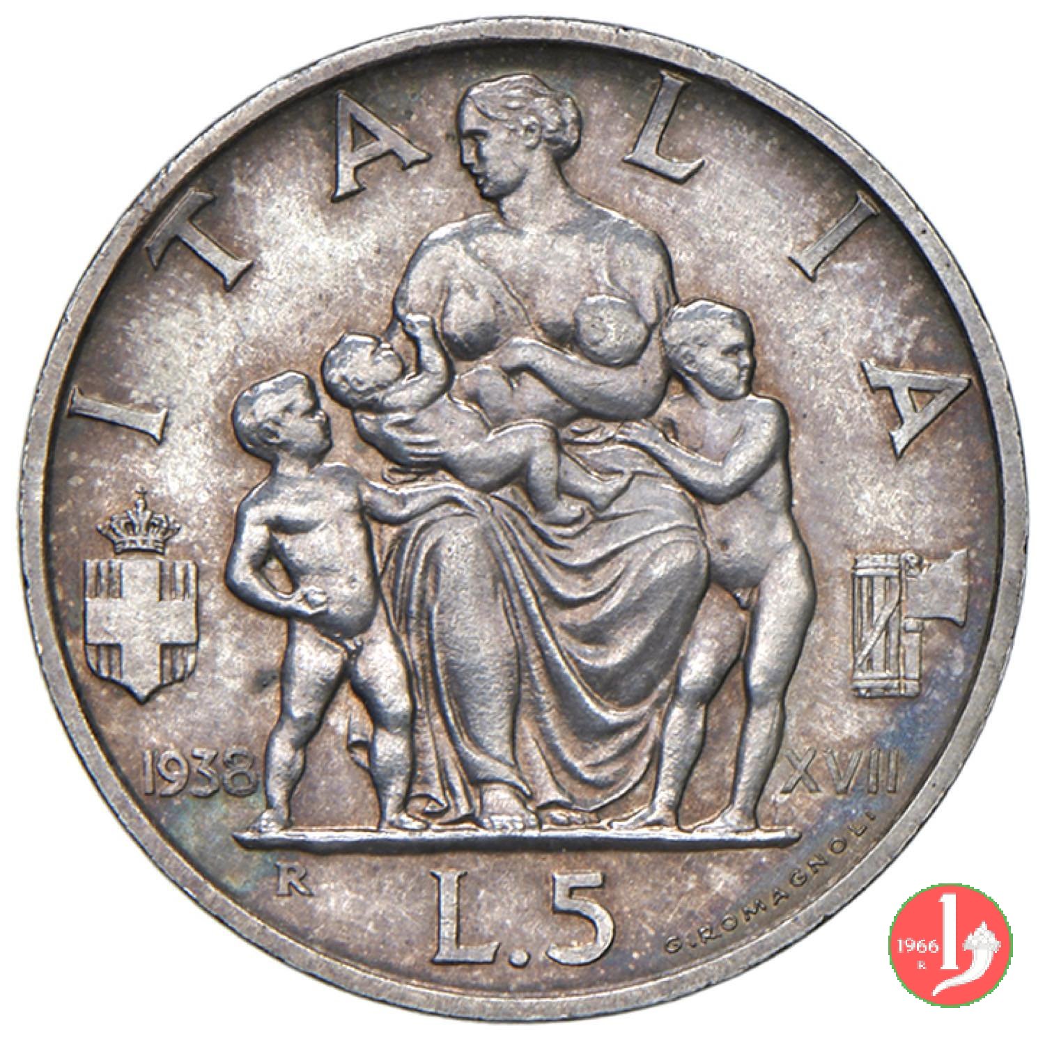 5 lire famiglia Obverse: Testa del Re volta a sinistra, contornata da: VITT • EM • III RE • E • IMP •. Reverse: Allegoria della fecondità: figura muliebre attorniata da bambini. A ore 8 stemma sabaudo con sotto la data, a ore 3 fascio littorio e millesimo dell'era fascista. In esergo, il valore (L • 5) ai lati il segno di zecca e il nome dell'autore: G • ROMAGNOLI. | |