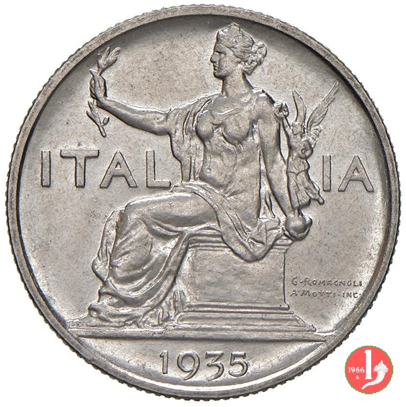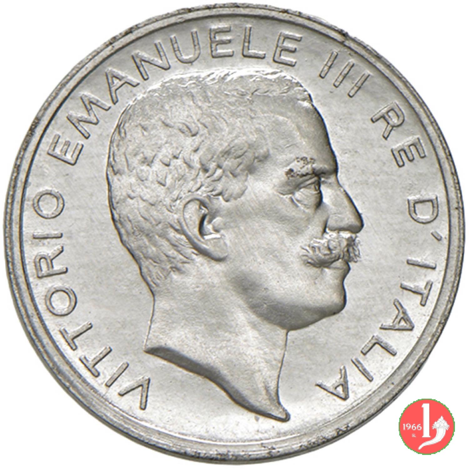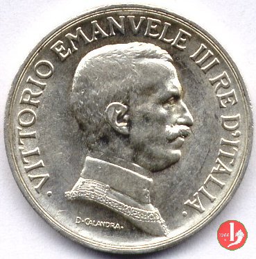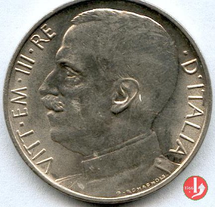 1 lira quadriga veloce Obverse: Semibusto in uniforme del Re volto a destra, contornato da: VITTORIO • EMANUELE • III • RE • D'ITALIA cerchiato. A ore 7 lungo il cerchio il nome dell'autore D • CALANDRA M •. Reverse: Figura allegorica dell'Italia con scudo, elmo e ramo di quercia posta su di un carro trainato da 4 cavalli. Il carro è adornato di nodi savoia. In esergo il valore (L • 1) tra due nodi savoia, sopra il nodo di sinistra il segno di zecca (R), sopra il nodo di destra il nome dell'incisore: L • GIORGI INC •, sopra l'esergo a sinistra il nome dell'autore D • CALANDRA M •. | |