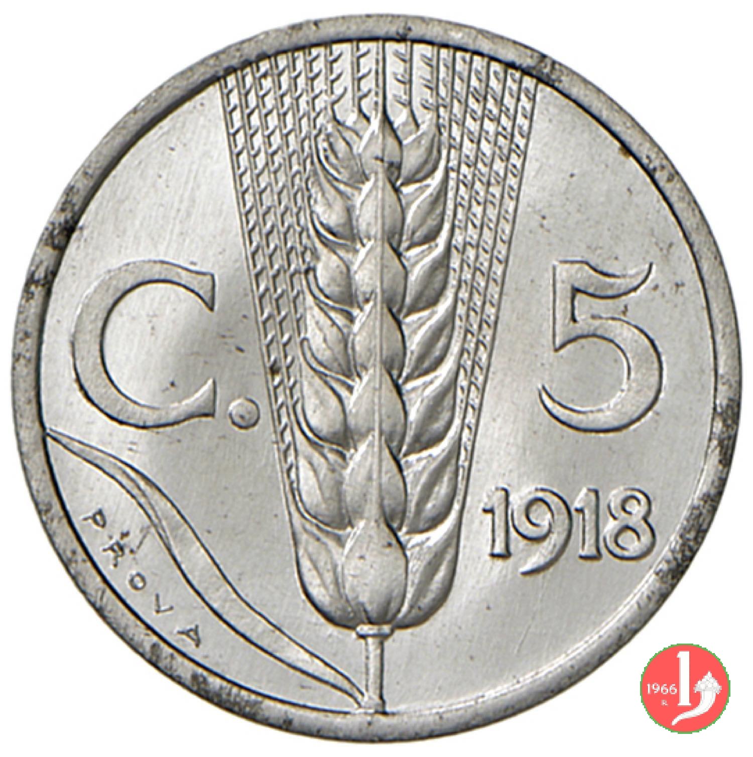 progetto 5 centesimi 1918 Obverse: Stemma sabaudo, coronato e circondato dal collare dell'Annunziata, in cartella adornata. In basso rami di lauro e di ulivo. In alto, lungo il bordo "REGNO D'ITALIA". Reverse: Spiga di grano, con foglia a sinistra, ai lati della quale è l'indicazione del valore (C. /5). A destra la data (1918) e a sinistra, circolarmente, la dicitura "PROVA". | |