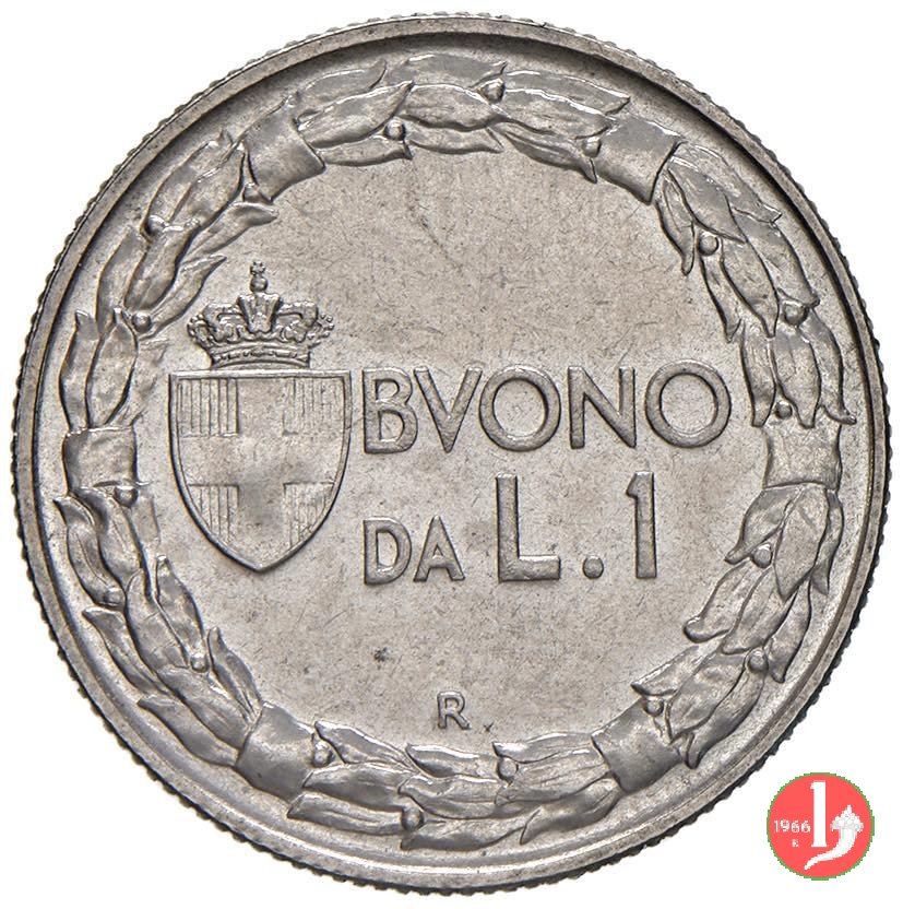 Buono da 1 lira Obverse: Figura allegorica simboleggiante l'Italia seduta su di un piedistallo e volta verso sinistra che regge con la destra un ramoscello di ulivo e con la sinistra una Vittoria alata. Sullo sfondo in orizzontale la scritta ITALIA. A destra del piedistallo i nomi degli autori G • ROMAGNOLI e A • MOTTI INC • su due righe. In esergo il millesimo. Reverse: Indicazione del valore (BUONO DA L • 1) su due righe affiancata dallo stemma Sabaudo con corona Reale. Lungo il bordo corona di alloro posta in senso orario. | |