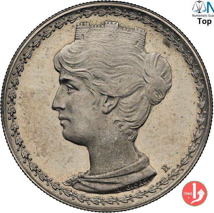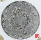 Scudo 50° Unità d'Italia Obverse: Testa del Re volta a sinistra, attorno: VITTORIO EMANUELE III RE D'ITALIA. Sotto il collo del Re i nomi dell'autore (D. TRENTACOSTE) e dell'incisore (L. GIORGI INC.). Reverse: Due figure allegoriche che simboleggiano l'Italia (la figura femminile) e la città di Roma (la figura maschile posta su di un piedistallo). Sullo sfondo la prora di una nave a vapore. A sinistra un aratro ornato con una ghirlanda di fiori a cui sono sovrapposte le date 1861-1911. A destra l'indicazione del valore (L • 5) e sotto il segno di zecca (R •). | |