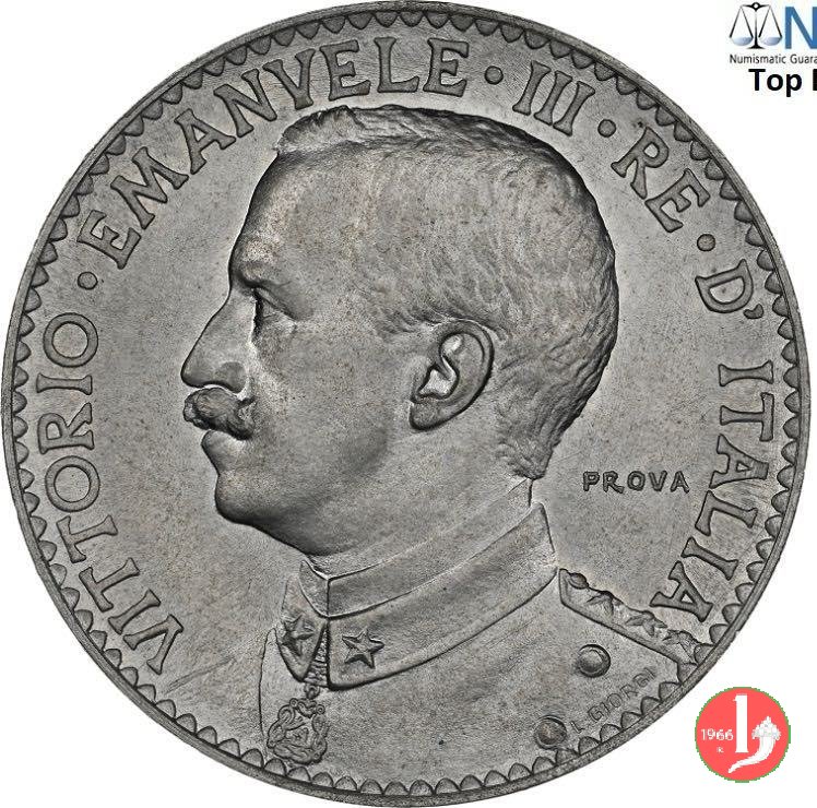 prova di metallo 10 centesimi 1919 Obverse: Busto, a testa nuda, volto a destra, in uniforme e con il collare dell'Annunziata. Intorno, circolarmente, "VITTORIO EMANVELE III RE D'ITALIA". Sotto il busto, il nome dell'autore (D. CALANDRA). Reverse: In alto, circolarmente, "PROVA DI METALLO". Nel campo, su cinque righe, "PER / MONETE / DA CENT. / 10 / ![]() ". | |
