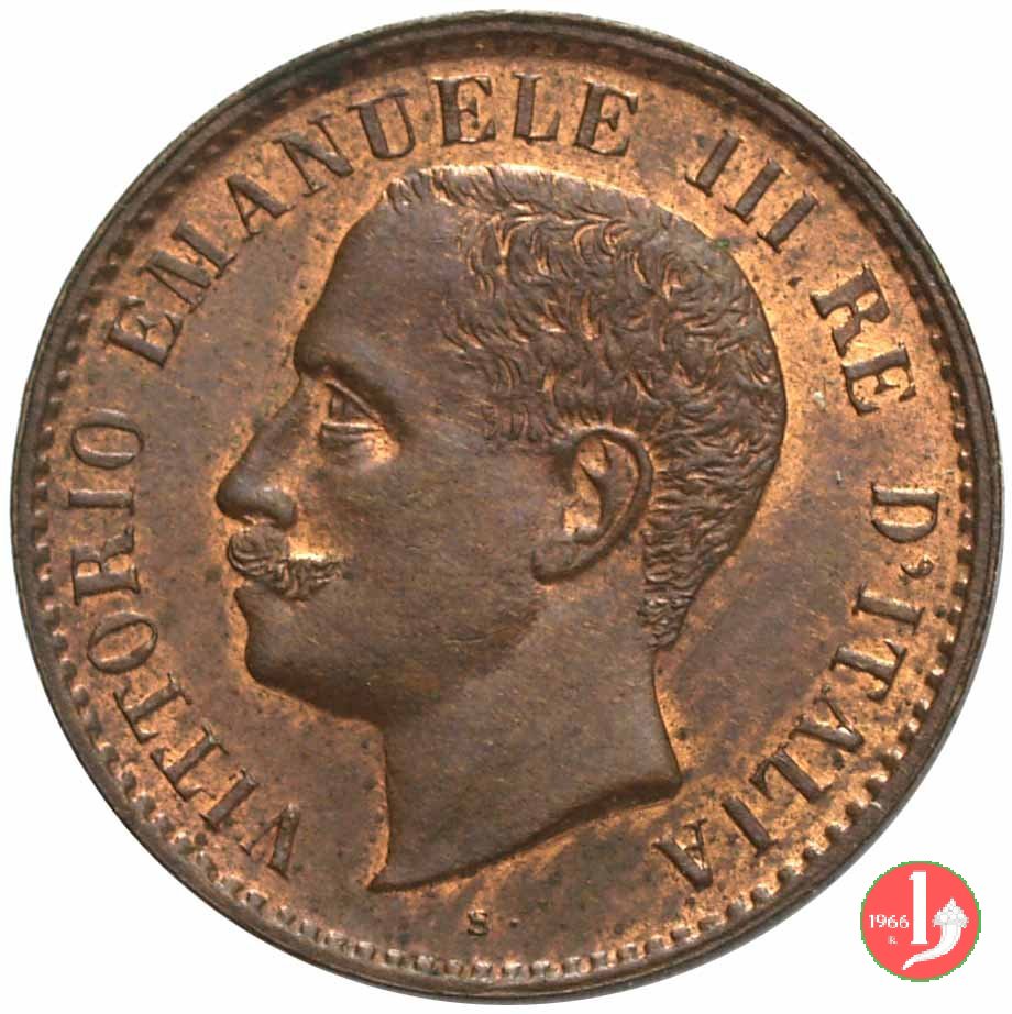 1 centesimo valore Obverse: Testa del Re a sinistra, intorno: VITTORIO EMANUELE III RE D'ITALIA. Sotto il collo S • (iniziale dell'autore Speranza). Reverse: 1 / CENTESIMO / (millesimo), su tre righe tra due rami di alloro e di rovere, in alto la stella Italiana ed in basso R (di zecca per Roma). | |