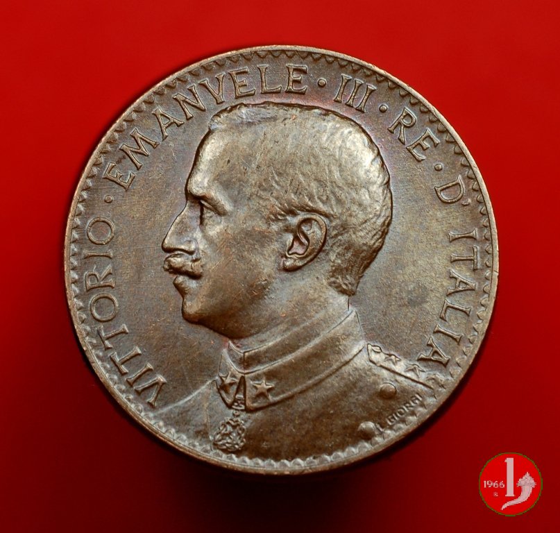 1 centesimo prora Obverse: Semi busto del Re in uniforme a sinistra, intorno: VITTORIO. EMANVELE. III. RE. D'ITALIA Reverse: Figura allegorica femminile simboleggiante l'Italia su di una nave con un ramoscello di ulivo nella mano destra. Sulla prua della nave R in rilievo (Roma), sulla fiancata le iniziali in incuso degli autori P.C.M. (Pietro Canonica) e (L.G.I.) Luigi Giorgi. In alto lungo il bordo CENT. 1. - (data). | |