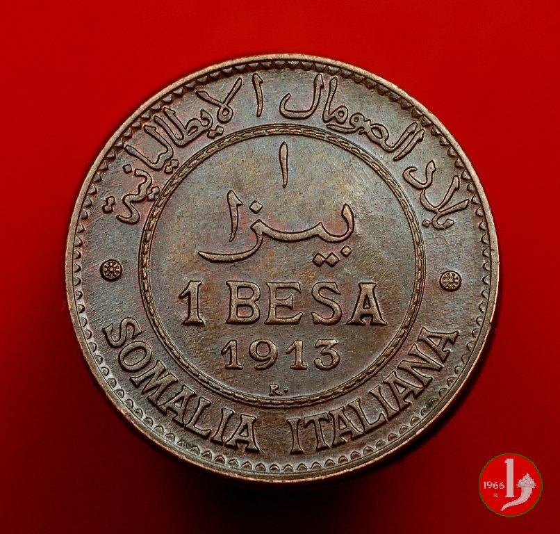 1 Besa Obverse: Nel campo indicazione del valore e del millesimo sia in italiano che in arabo all'interno di un cerchio. Intorno SOMALIA ITALIANA nella parte inferiore e in arabo nella parte superiore; le due scritte sono separate da due rosette. Sotto la data in caratteri latini, il segno di zecca (R •). Reverse: Semibusto del Re in uniforme visto di fronte ma volto a sinistra. Lungo il bordo la scritta VITTORIO • EMANVELE • III • RE • D'ITALIA • e ad ore 4 il nome dell'autore (L • GIORGI) in incuso. | |