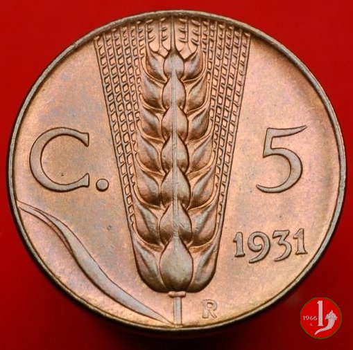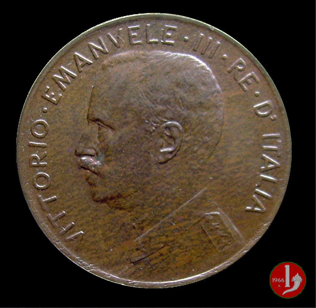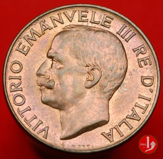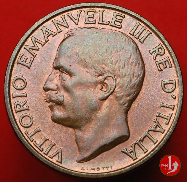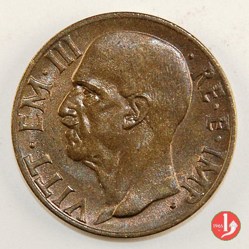 5 centesimi spiga Obverse: Testa del Re a sinistra. Intorno VITTORIO EMANVELE III RE D'ITALIA. Sotto il collo il nome dell'incisore (A • MOTTI). Reverse: Spiga di grano con foglia a sinistra e valore (C • 5) intorno. A destra del fusto della spiga in basso segno di zecca, sempre a destra sotto il 5 del valore il millesimo. | |